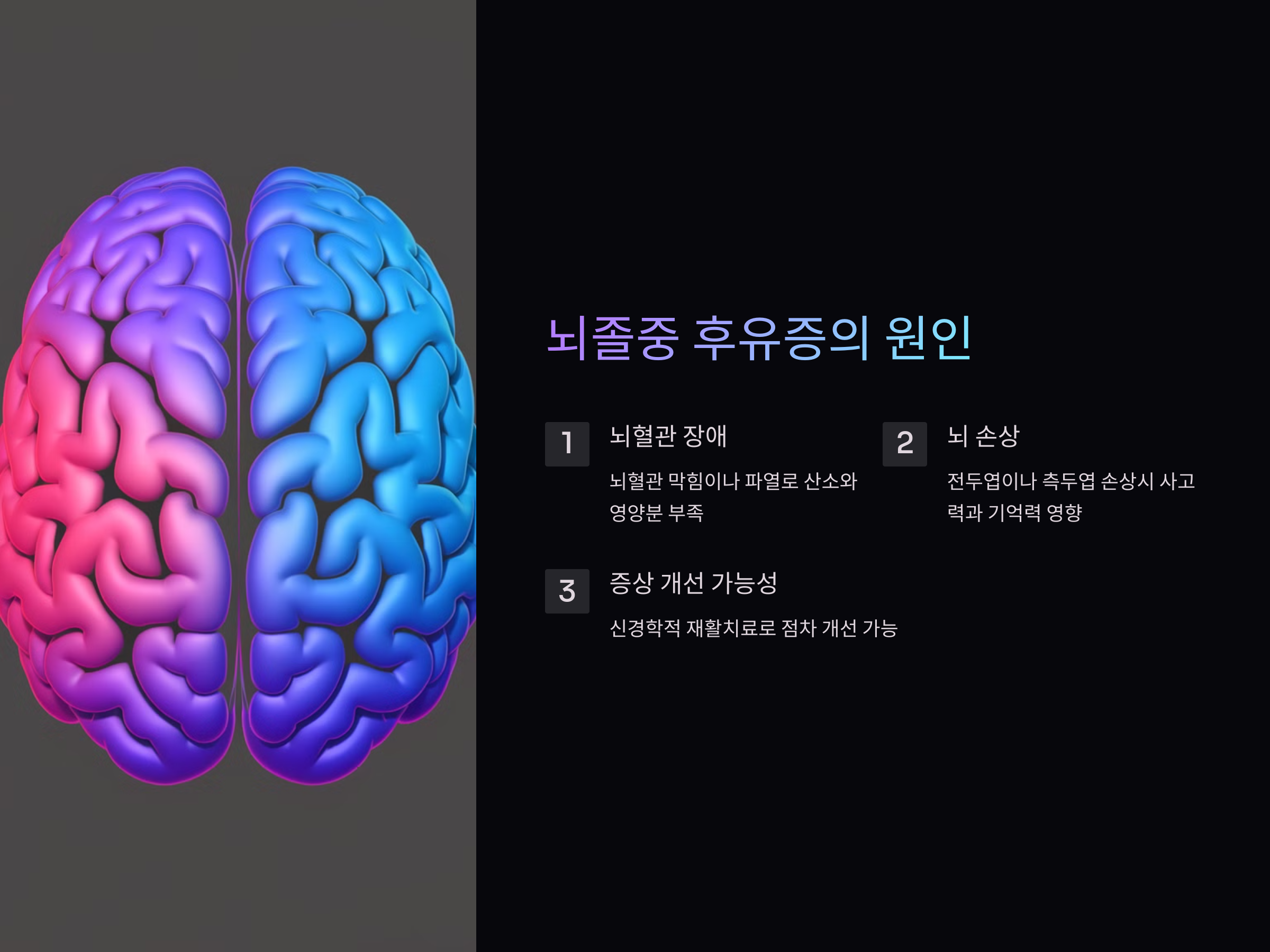 뇌졸중 후유증은 뇌혈관이 막히거나 터져서 뇌에 산소와 영양분이 충분히 공급되지 않아 발생하는 증상들입니다. 뇌졸중이 발생한 후, 집중력 저하와 멍해짐은 흔히 나타날 수 있는 후유증입니다. 이러한 증상은 뇌의 특정 부위가 손상되었을 때 발생할 수 있으며, 그 손상된 부위가 담당하던 기능이 제대로 작동하지 않기 때문입니다. 예를 들어, 뇌의 전두엽이나 측두엽이 손상되면 사고력과 기억력, 집중력에 영향을 미칠 수 있습니다.