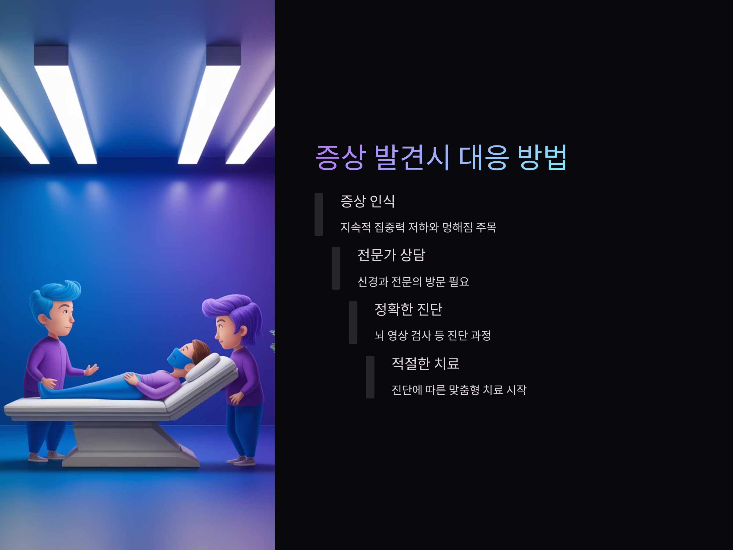 집중력 저하와 멍해짐은 단순히 피로나 스트레스로 끝나지 않으며, 뇌졸중 후유증이나 치매 초기 증상일 수 있습니다. 이 증상이 나타난다면, 적절한 조기 진단과 치료가 필요합니다. 뇌졸중 후유증은 적극적인 재활을 통해 개선될 수 있으며, 치매는 증상의 진행을 늦출 수 있는 다양한 치료 방법이 있습니다.