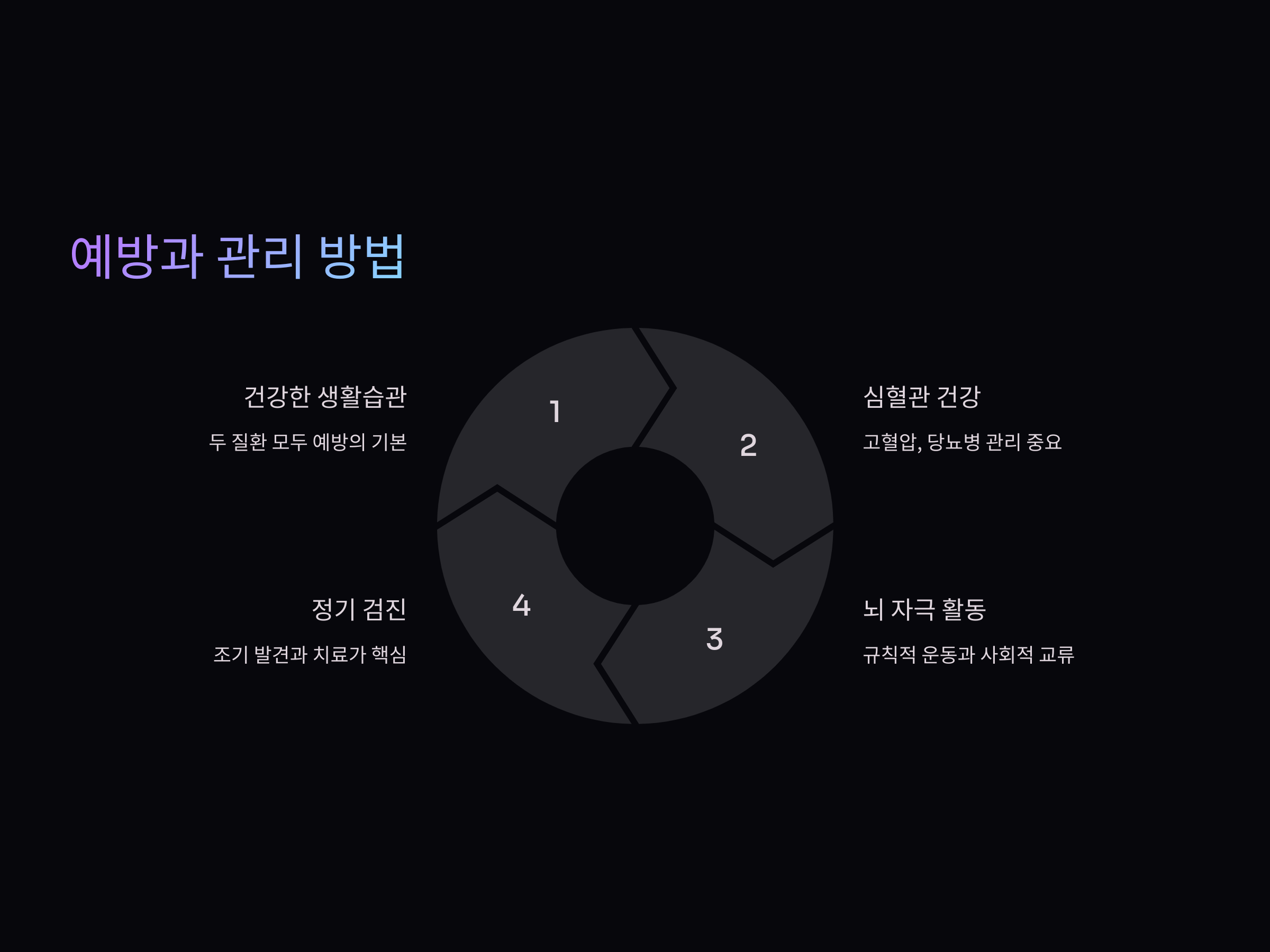 뇌졸중 후유증과 치매 초기 증상 모두 예방과 관리가 중요한 질환입니다. 두 질환 모두 건강한 생활습관을 유지하는 것이 가장 중요한 예방책입니다. 뇌졸중 예방을 위해서는 고혈압, 당뇨병, 고지혈증 등을 관리하고, 규칙적인 운동과 균형 잡힌 식사를 통해 심혈관 건강을 유지해야 합니다. 또한, 치매 예방을 위해서는 뇌를 자극하는 활동, 규칙적인 운동, 그리고 충분한 사회적 교류가 필요합니다.