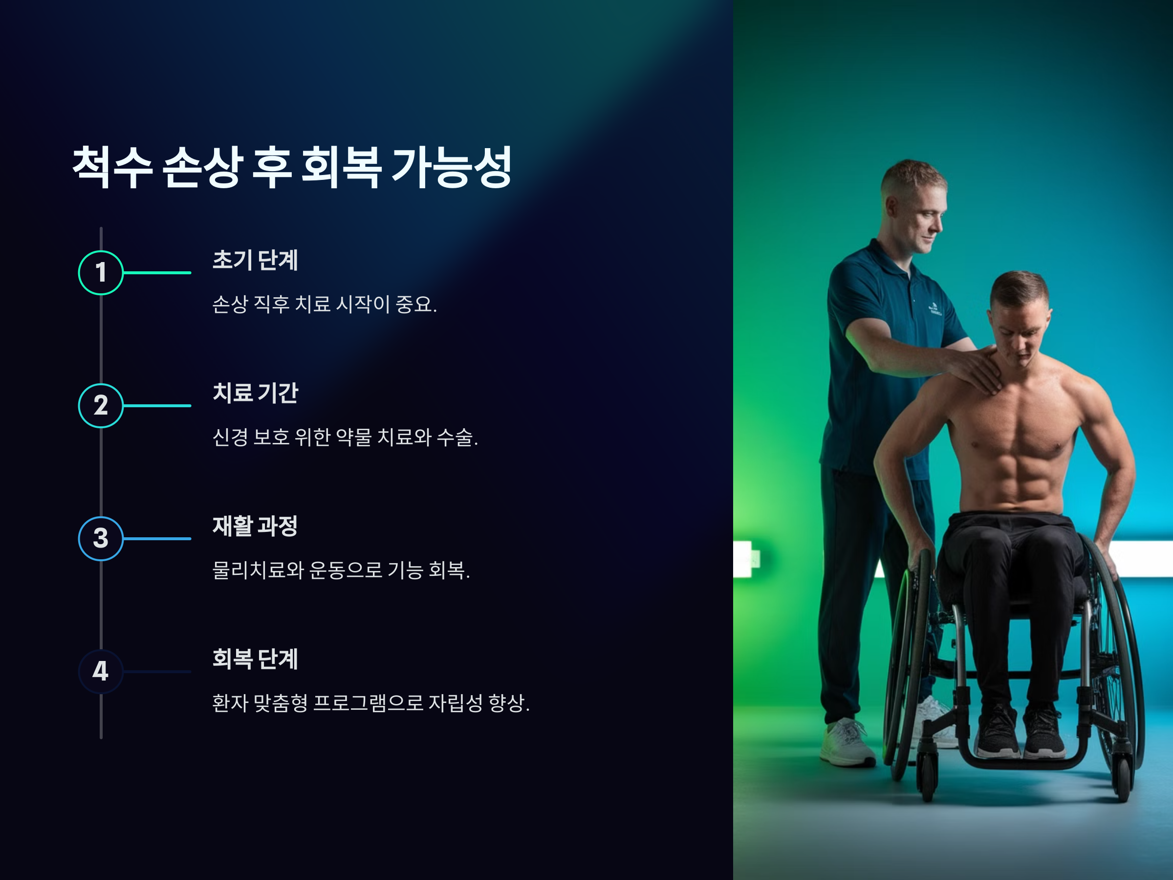 척수 손상이 발생하고 나서, 치료가 시작되기까지의 시간은 매우 중요합니다. 손상 직후 치료가 시작될수록 회복 가능성이 높아집니다. 특히, 초기에는 신경 보호를 위한 약물 치료나 수술을 통해 손상된 부위를 복구하거나 압박을 줄이는 등의 방법을 사용할 수 있습니다. 이러한 초기 치료가 빠르게 이루어지면, 신경 회복이 어느 정도 이루어질 수 있습니다.