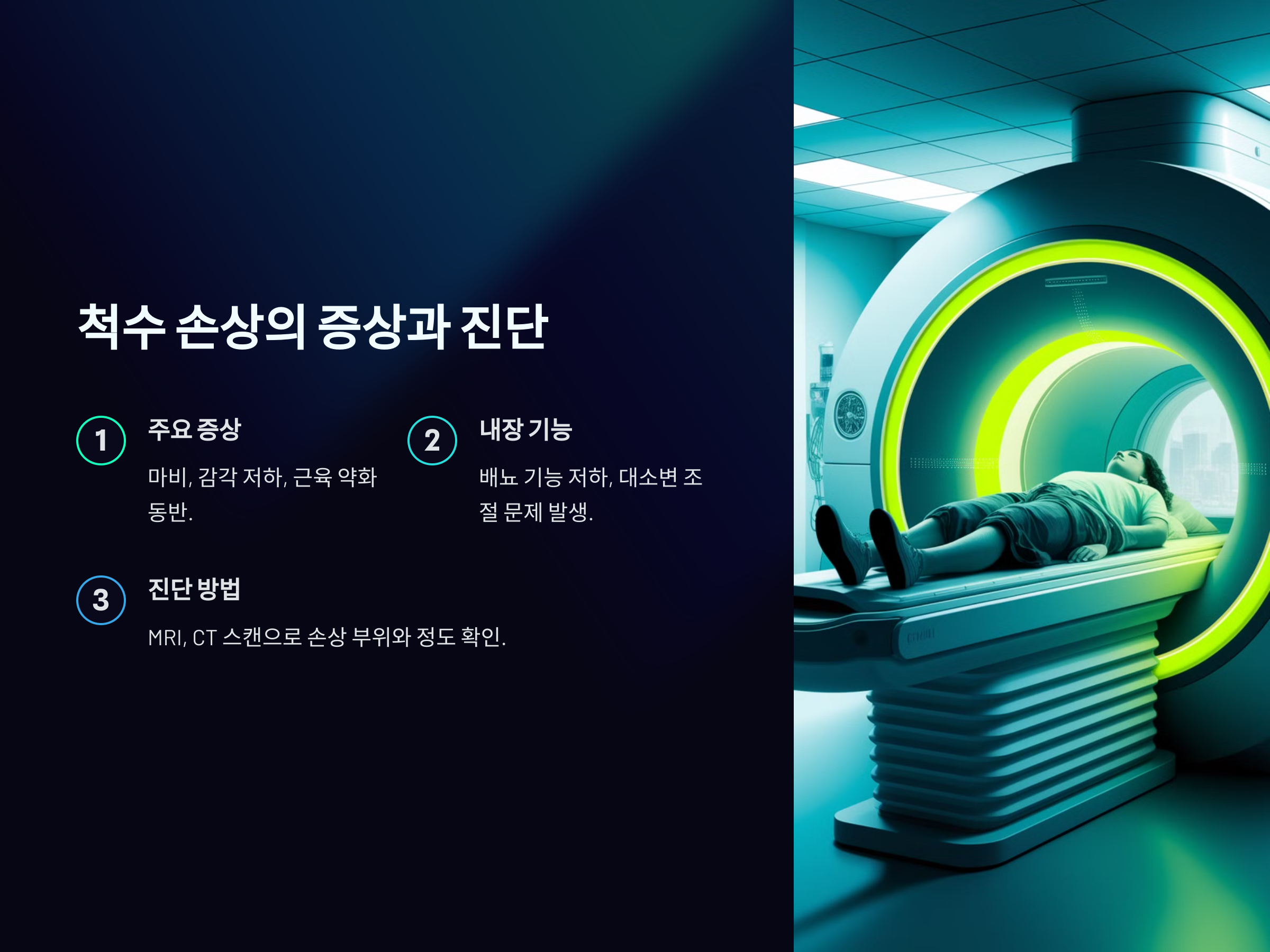 척수 손상이 의심될 경우, MRI나 CT 스캔 등을 통해 정확한 진단을 내리게 됩니다. 이러한 검사들은 척수의 손상 부위를 정확히 파악하고, 그 정도를 알 수 있는 중요한 도구입니다. 이를 통해 전문가들은 손상의 범위와 예후를 예측하고, 그에 맞는 치료 방법을 제시할 수 있습니다.
