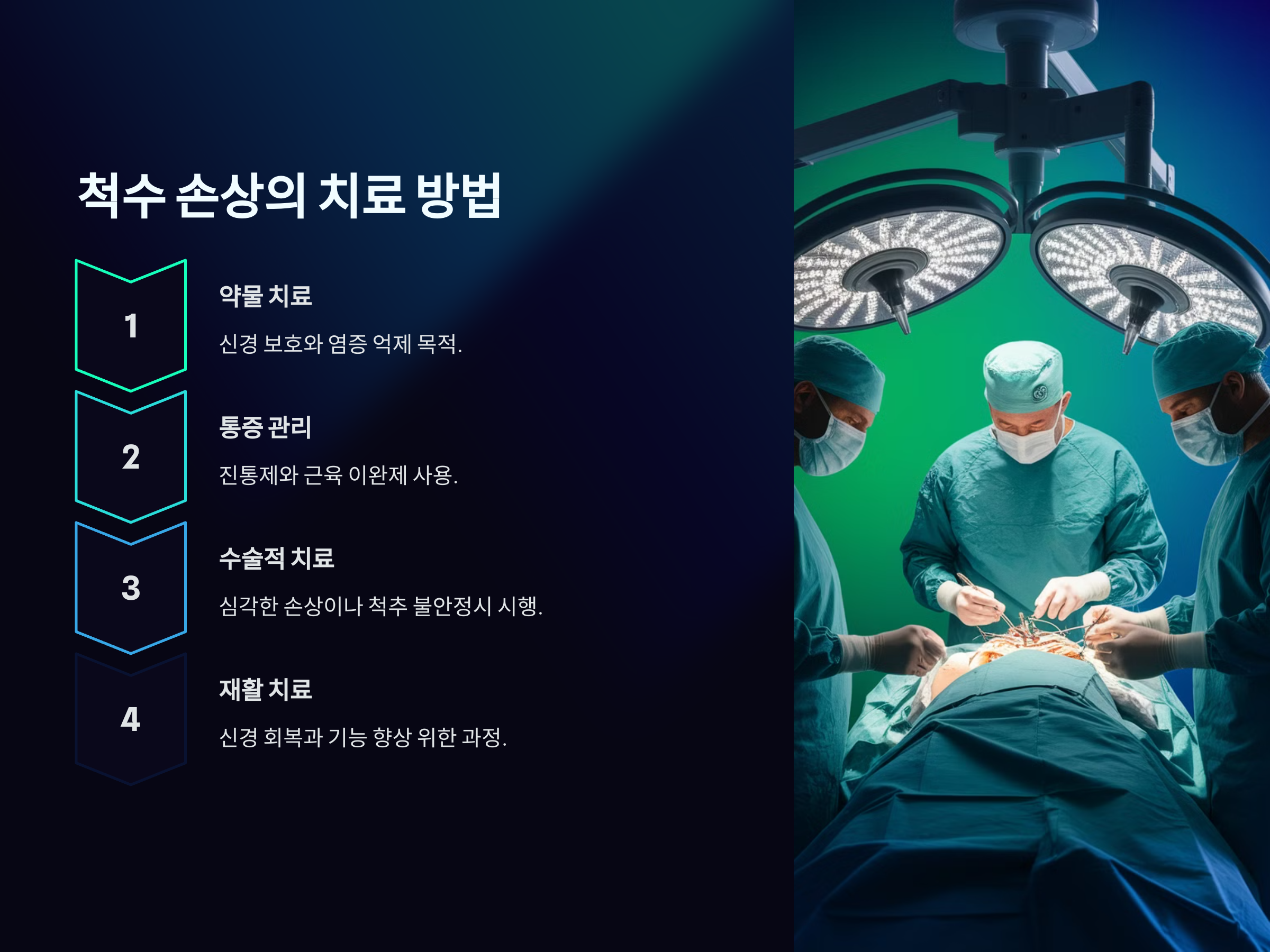 척수 손상에 대한 치료는 크게 보존적 치료와 수술적 치료로 나눌 수 있습니다. 보존적 치료는 약물 치료, 물리 치료 등을 포함하며, 수술적 치료는 손상된 척수를 복구하거나 척추의 압박을 풀어주는 수술을 포함합니다.