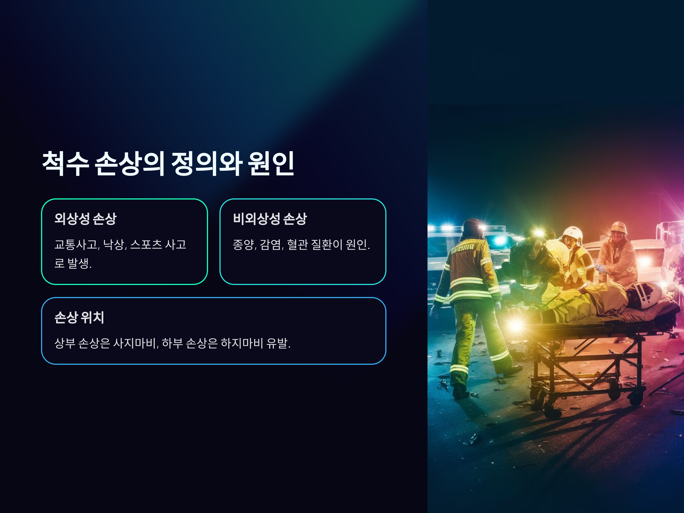 척수 손상은 크게 두 가지 유형으로 나눠볼 수 있습니다. 첫째는 외상성 손상으로, 사고나 외부 충격에 의해 발생하는 것입니다. 둘째는 비외상성 손상으로, 질병이나 감염에 의해 발생할 수 있습니다. 외상성 손상의 경우, 교통사고나 추락 사고, 스포츠 사고 등이 주요 원인으로 작용하며, 비외상성 손상의 경우는 종양, 감염, 혈관 질환 등이 원인으로 작용할 수 있습니다.