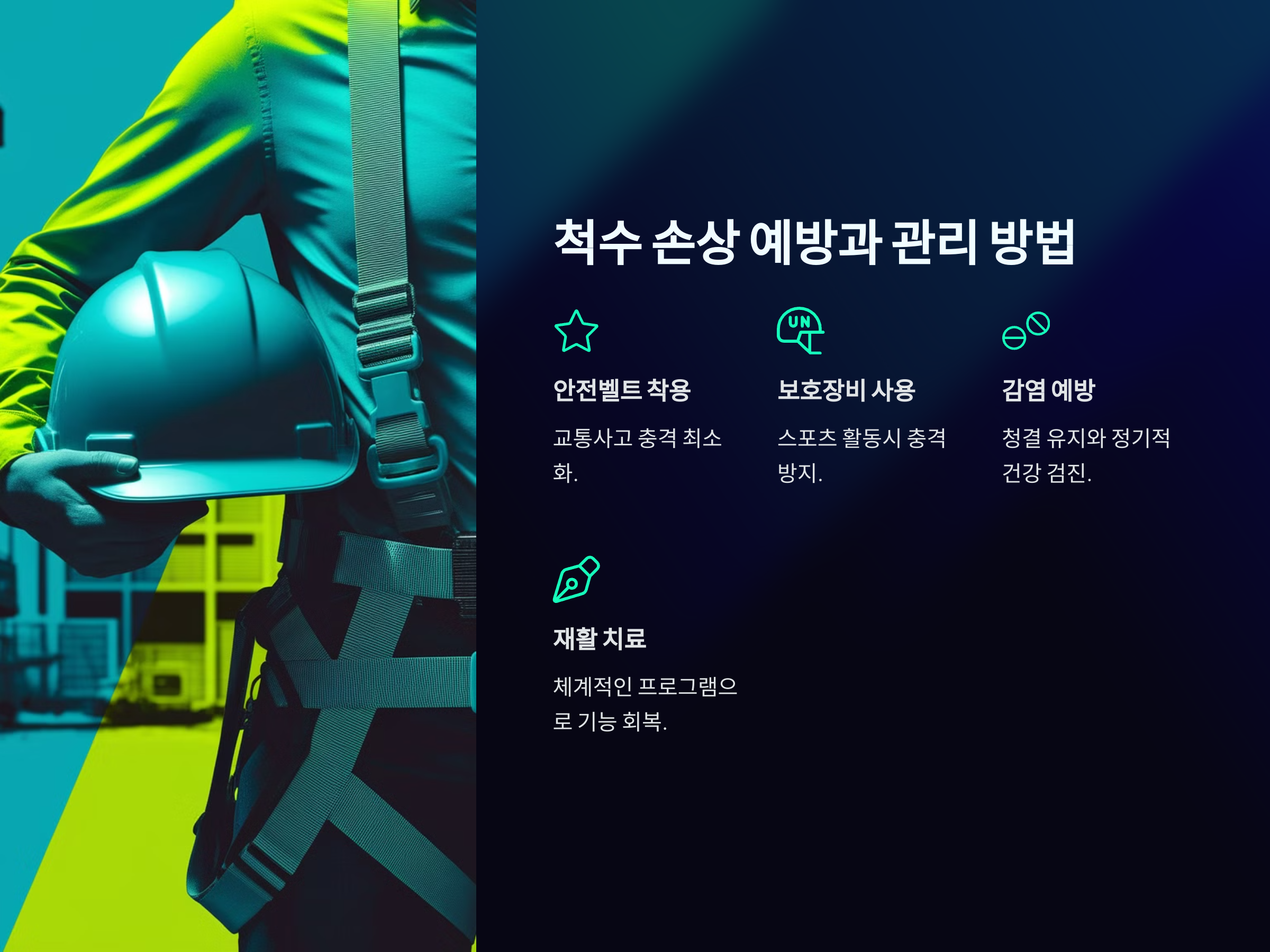 척수 손상을 예방하는 방법은 사고나 외부 충격을 최소화하는 것입니다. 이를 위해서는 교통사고 예방을 위한 안전벨트 착용, 스포츠 활동 시 보호 장비 착용, 높은 곳에서 작업할 때 안전망 사용 등 기본적인 안전 수칙을 지키는 것이 중요합니다.