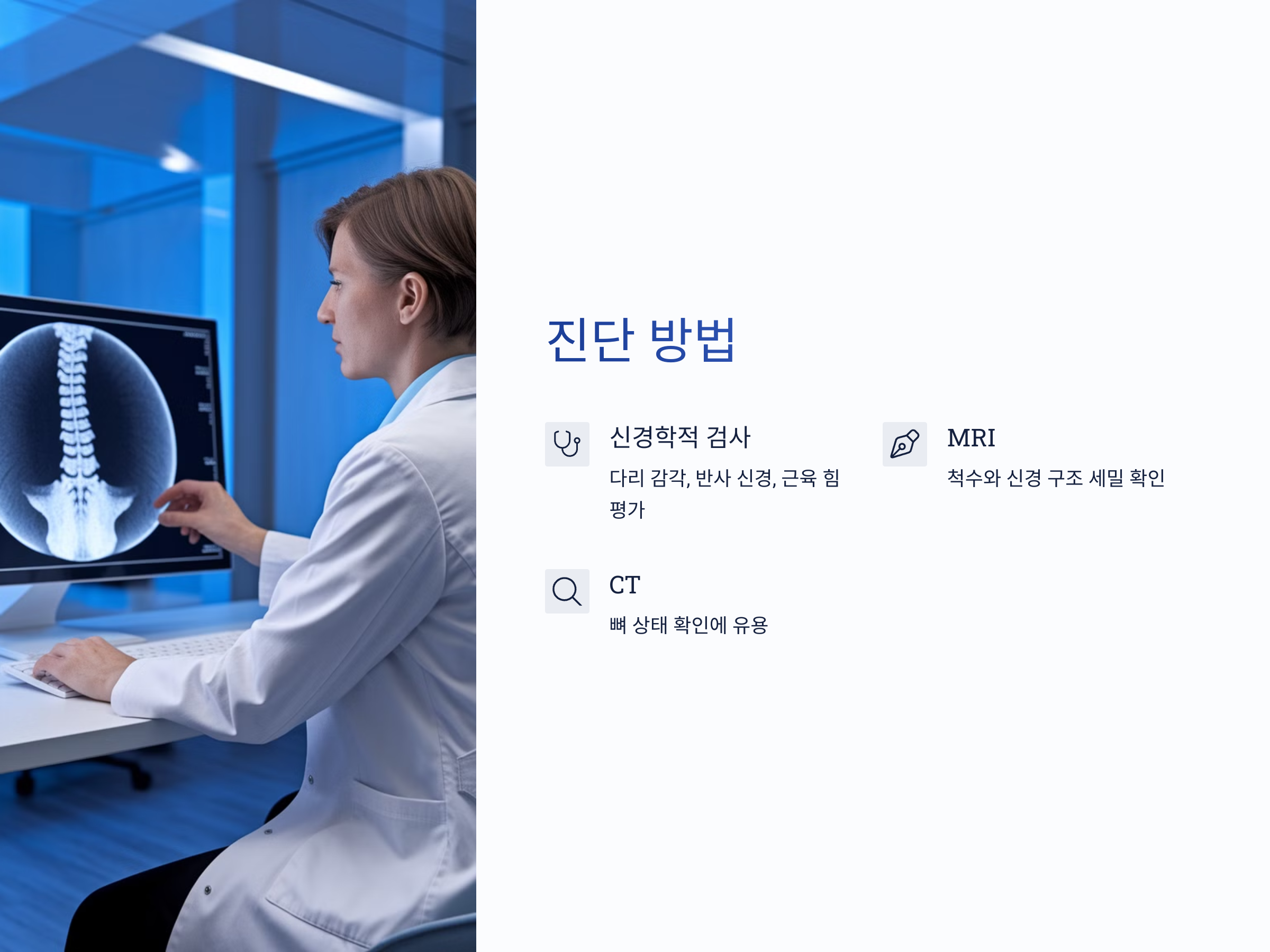 척수 신경 압박을 진단하기 위해서는 신경학적 검사와 이미지 검사 등이 필요합니다. 신경학적 검사는 환자의 다리 감각과 반사 신경, 근육의 힘 등을 평가하는 과정입니다. 이를 통해 척수 압박 여부를 파악할 수 있습니다.