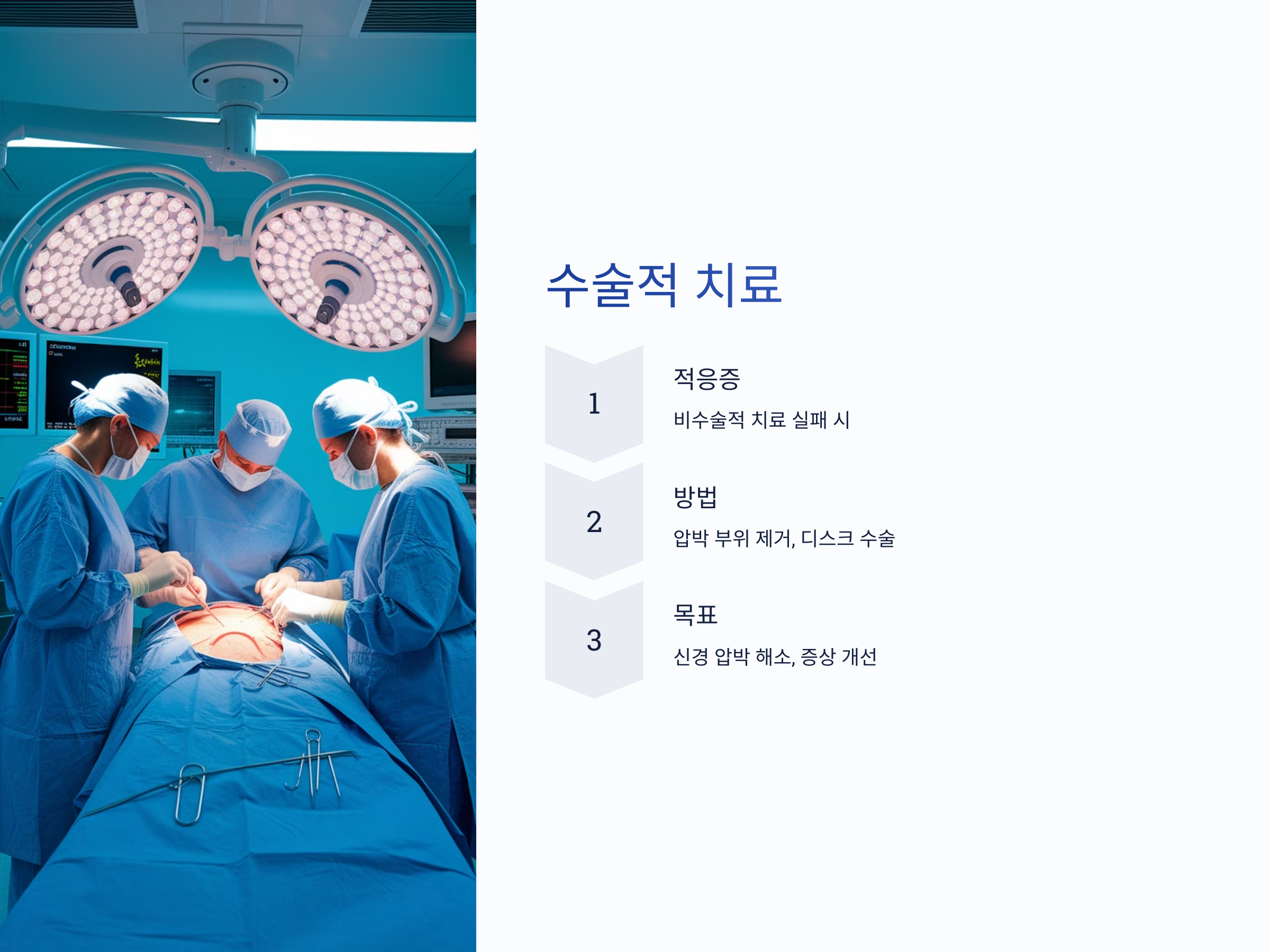 그러나 비수술적 치료로 증상이 호전되지 않는 경우에는 수술이 필요할 수 있습니다. 수술 방법으로는 척추의 압박된 부위를 제거하거나, 추간판 탈출증을 치료하기 위한 수술이 있습니다. 수술은 일반적으로 증상이 심각한 경우나, 비수술적 치료로 효과를 볼 수 없는 경우에 고려됩니다.