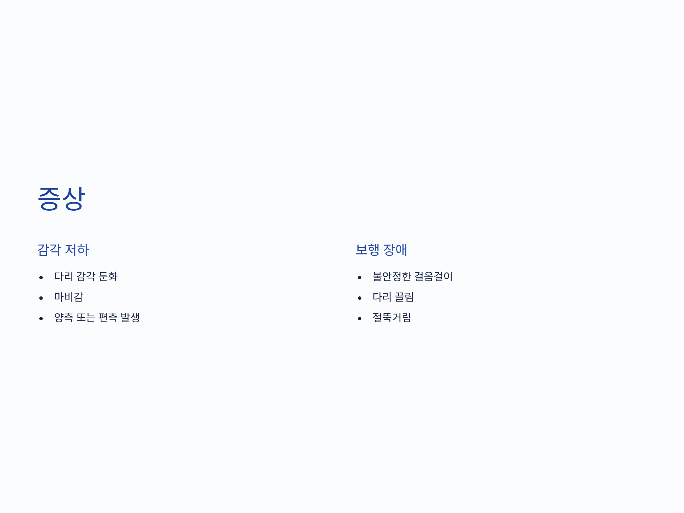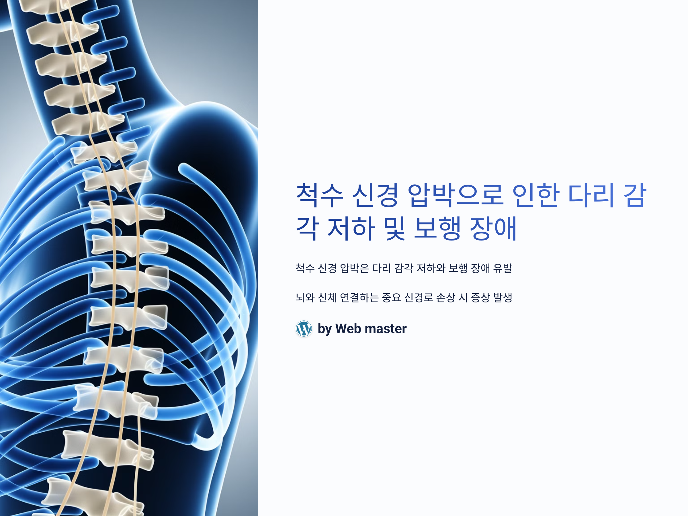 척수 압박의 주요 원인으로는 추간판 탈출증(허리 디스크), 척추관 협착증, 종양, 외상 등이 있습니다. 이러한 질환들이 척수와 그에 연결된 신경을 압박하면서, 다리의 감각 저하와 함께 보행이 어려워질 수 있습니다. 만약 이런 증상이 지속되면, 신경 손상이 더욱 심화될 수 있기 때문에 조기에 치료를 받는 것이 중요합니다.
