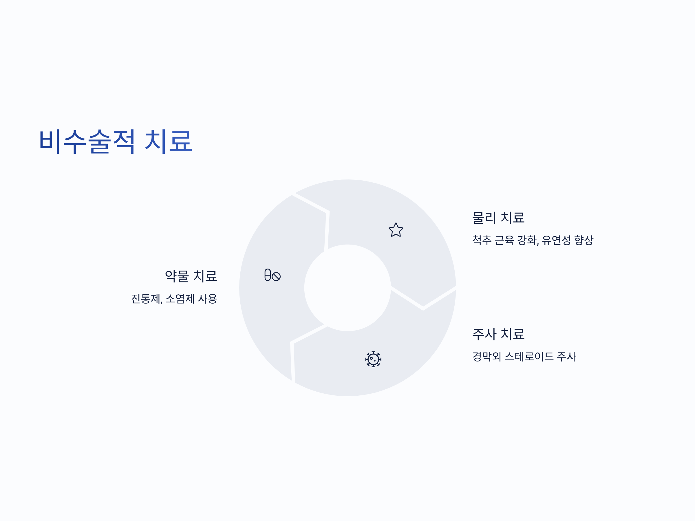 척수 신경 압박의 치료 방법은 원인에 따라 다르며, 치료의 목표는 신경 압박을 완화하고 증상을 개선하는 것입니다. 대부분의 경우, 비수술적 치료 방법부터 시작합니다. 약물 치료, 물리 치료, 그리고 주사 치료가 대표적인 비수술적 방법입니다.