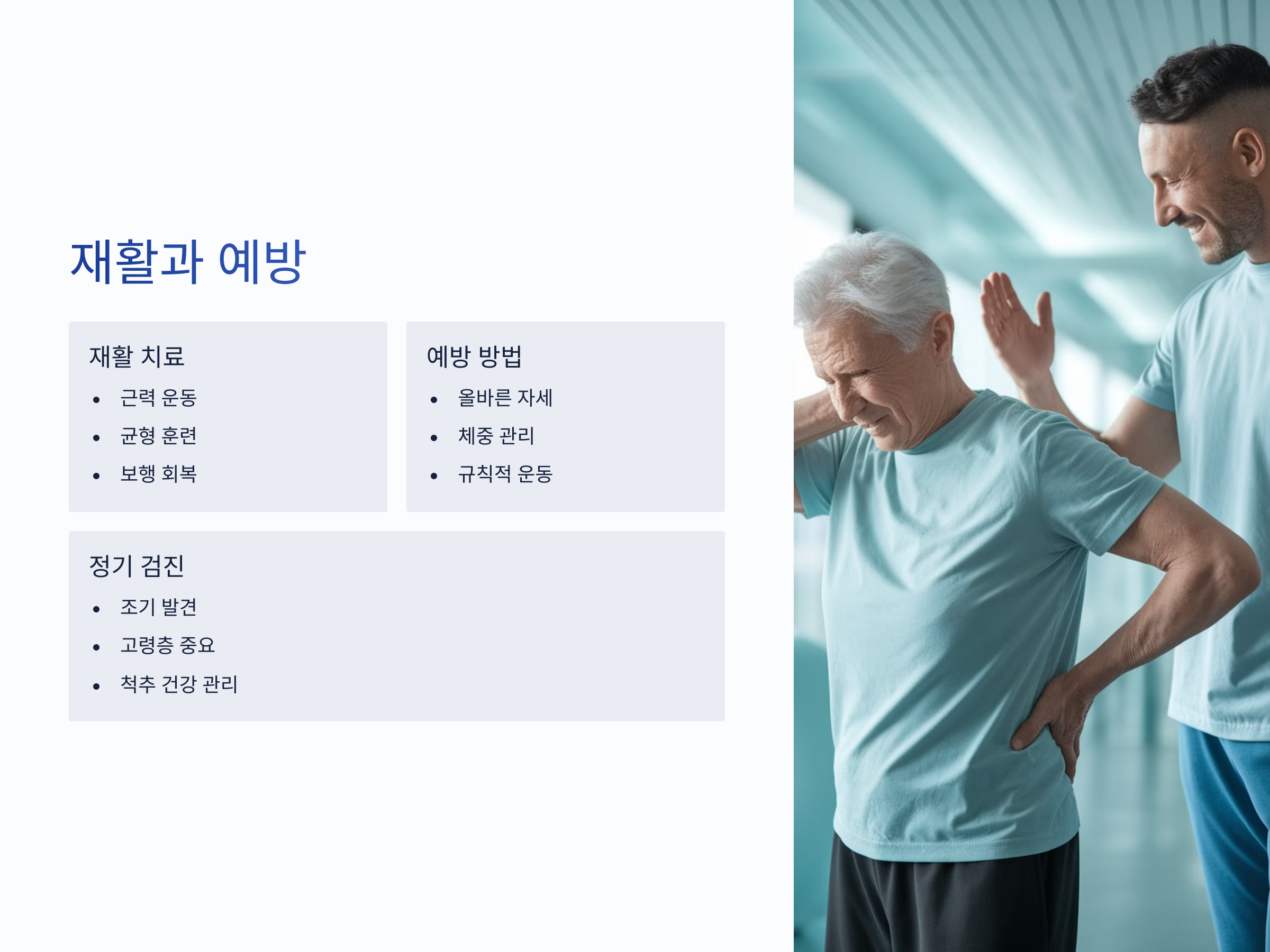 예방을 위해서는 척추 건강을 유지하는 것이 중요합니다. 적절한 자세를 유지하고, 과도한 체중을 피하며, 규칙적인 운동을 통해 근력을 강화하는 것이 척수 압박을 예방하는 데 도움이 됩니다. 또한, 고령층에서는 정기적인 건강 검진을 통해 척추 질환을 조기에 발견하고 예방하는 것이 중요합니다.