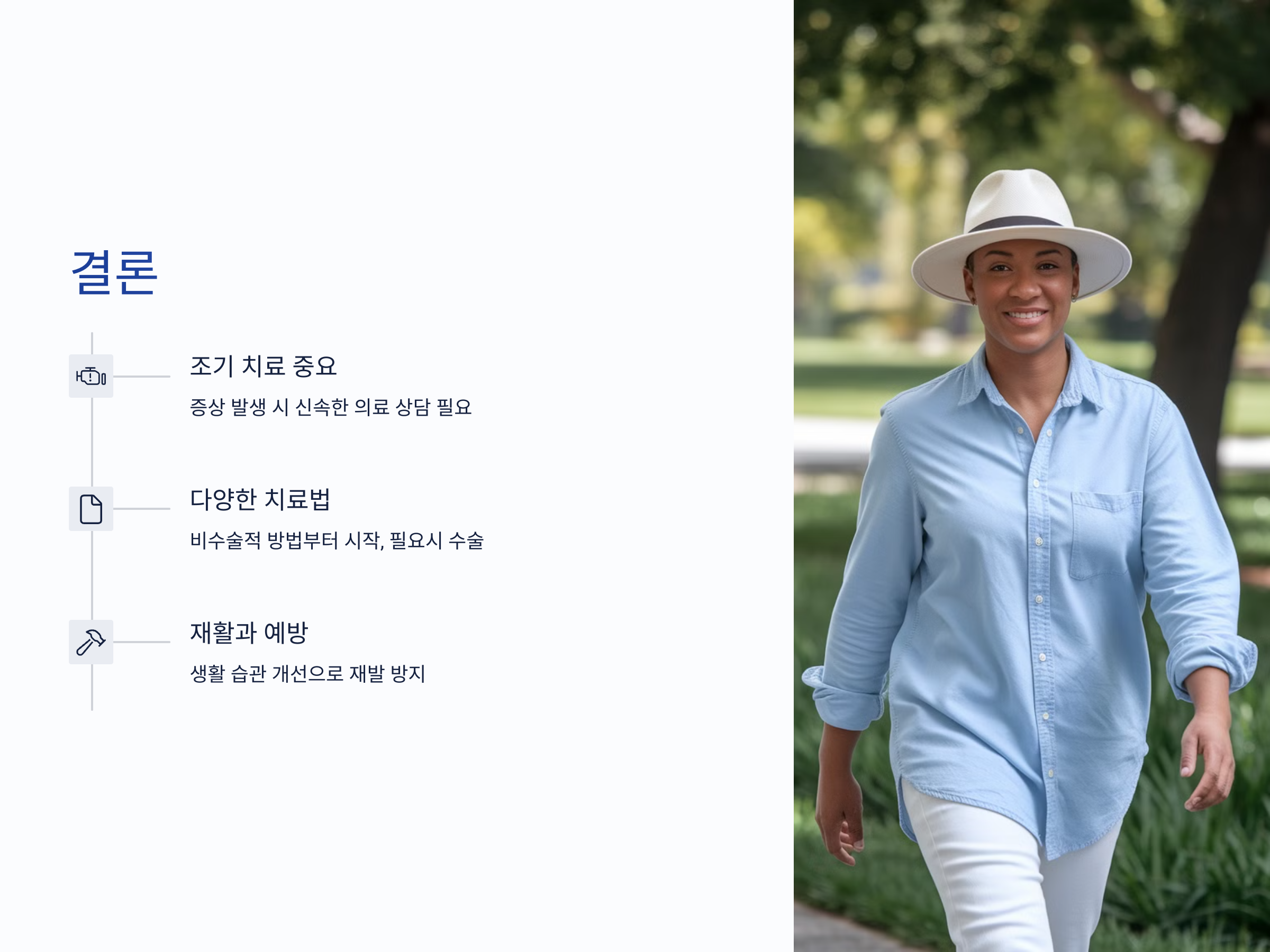척수 신경 압박으로 인한 다리 감각 저하 및 보행 장애는 심각한 생활의 질 저하를 초래할 수 있습니다. 이러한 증상이 나타나면 신속히 치료를 받는 것이 중요합니다. 비수술적 치료가 대부분 효과적일 수 있지만, 상태가 심각한 경우에는 수술적 치료가 필요할 수 있습니다. 또한, 치료 후에는 재활을 통해 회복을 도모하고, 예방을 위한 꾸준한 운동과 건강 관리가 필요합니다.