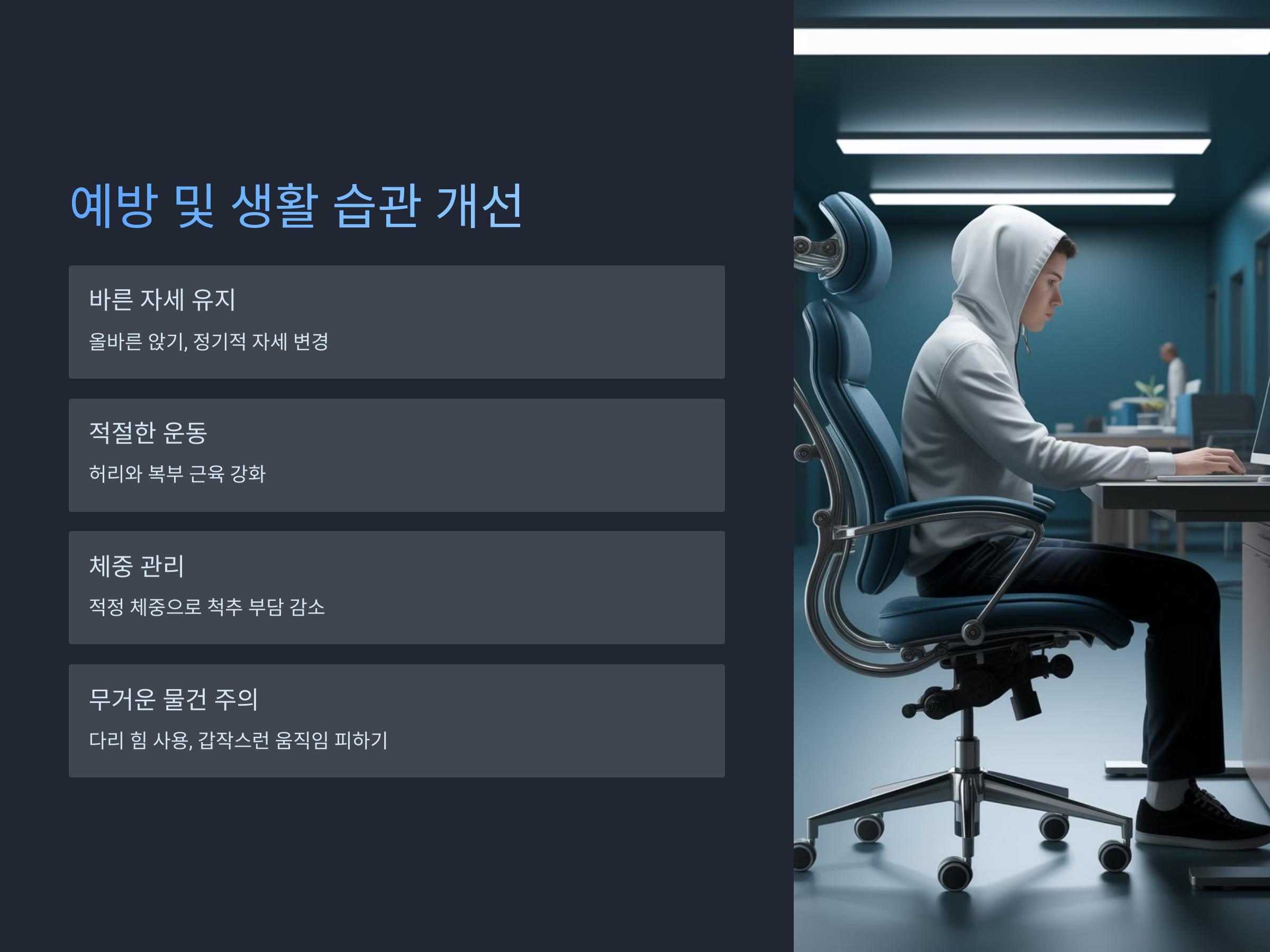 - 적절한 운동: 허리와 복부 근육을 강화하는 운동을 통해 척추를 지지합니다.