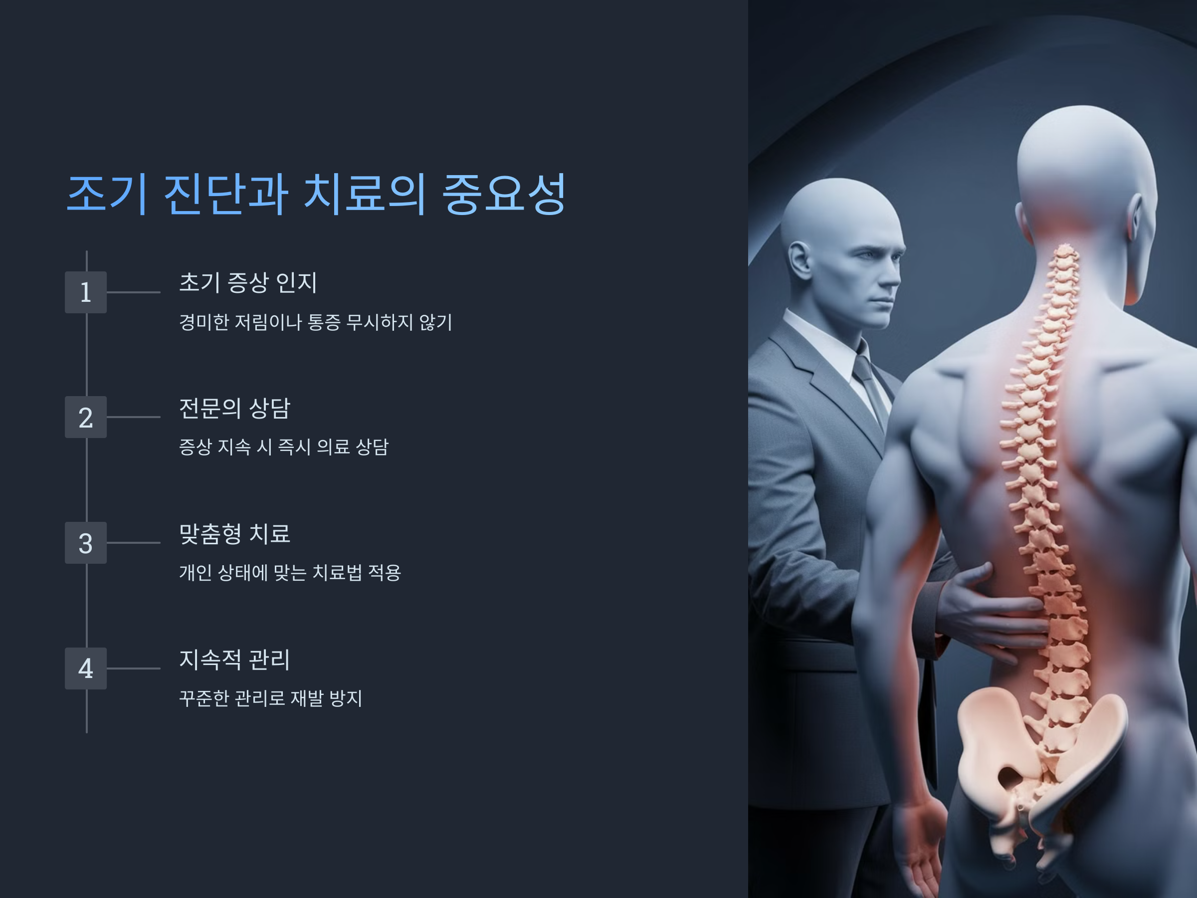 척수 신경 압박으로 인한 다리 감각 저하와 보행 장애는 삶의 질을 크게 저하시킬 수 있습니다. 증상이 나타나면 조기에 전문의를 찾아 정확한 진단과 적절한 치료를 받는 것이 중요합니다. 또한, 생활 습관의 개선을 통해 증상의 예방과 완화를 도모할 수 있습니다.