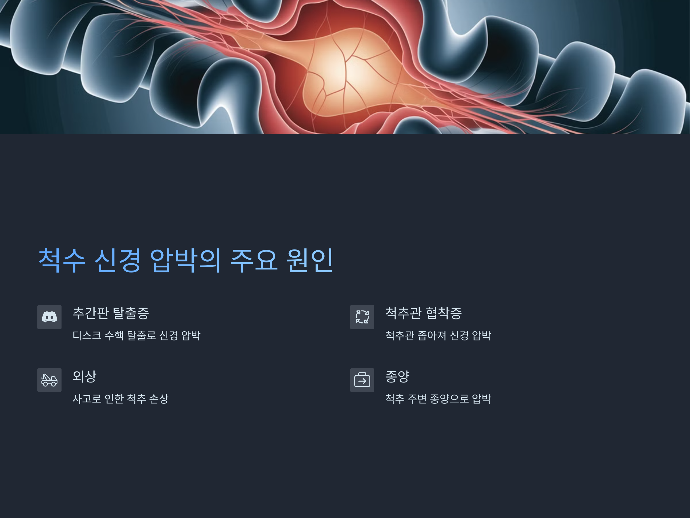 척수 신경 압박은 다양한 요인에 의해 발생할 수 있습니다. 대표적인 원인으로는 다음과 같습니다: