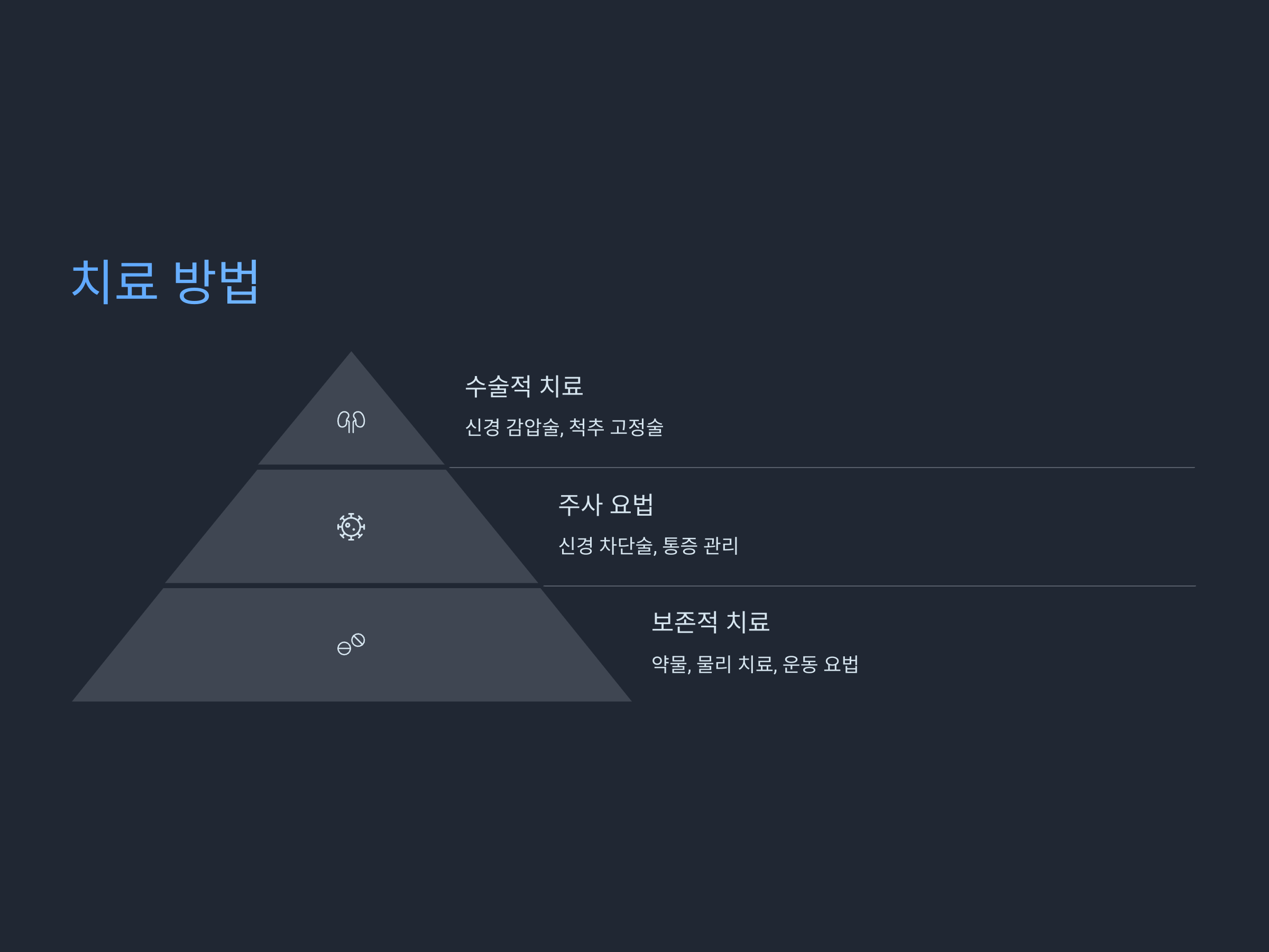 - 주사 요법: 신경 차단술 등을 통해 통증을 관리할 수 있습니다.