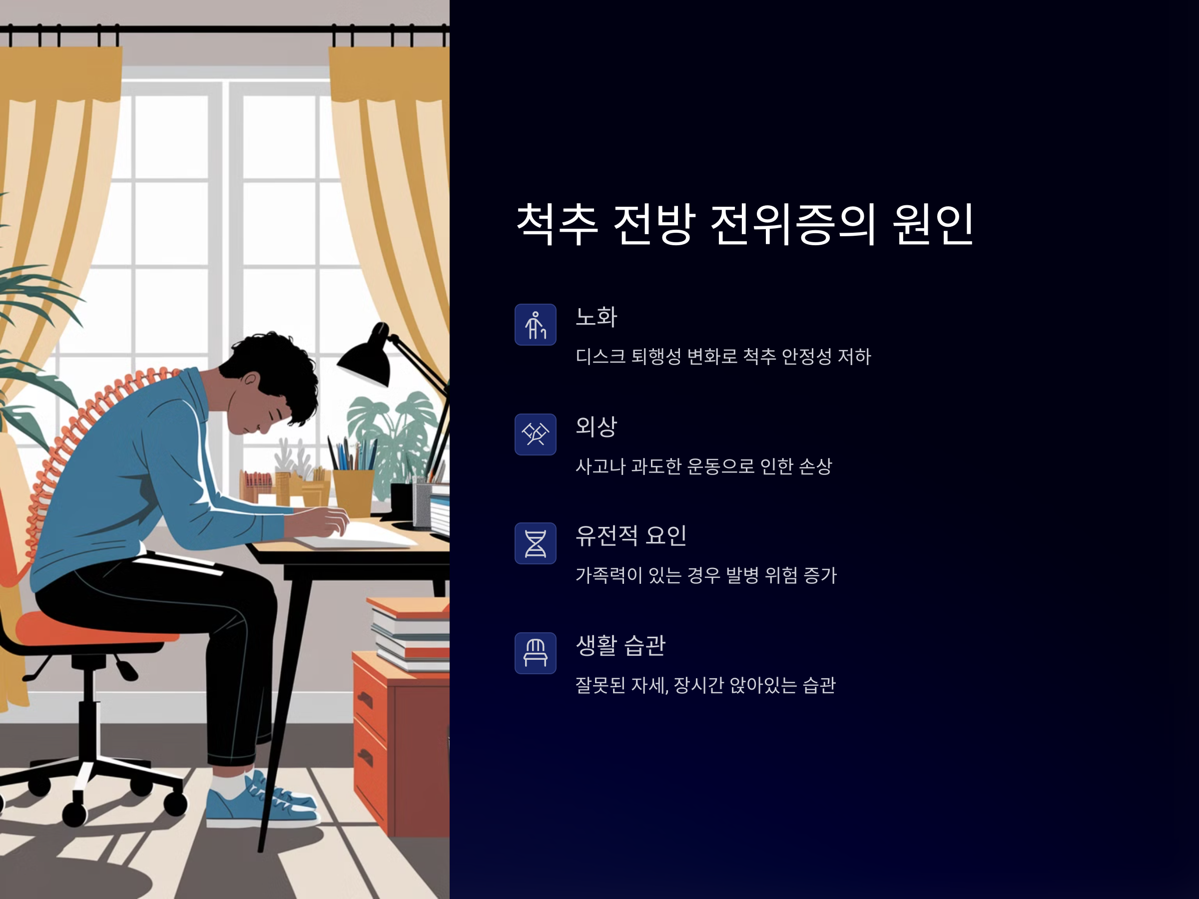 척추 전방 전위증의 주요 원인은 노화로 인한 디스크의 퇴행성 변화입니다. 나이가 들면서 척추의 디스크가 점차적으로 수분을 잃고, 그로 인해 척추의 안정성이 떨어집니다. 이 외에도 사고나 외상, 과도한 운동 등이 원인으로 작용할 수 있습니다. 또한, 유전적인 요인이나 잘못된 자세, 장시간 앉아 있는 생활 습관도 전방 전위증을 유발하는 중요한 요소들입니다. 척추의 불안정성이 커지면서 디스크와 인대가 약해지고, 그 결과 척추 뼈가 서로 밀려나가게 됩니다.