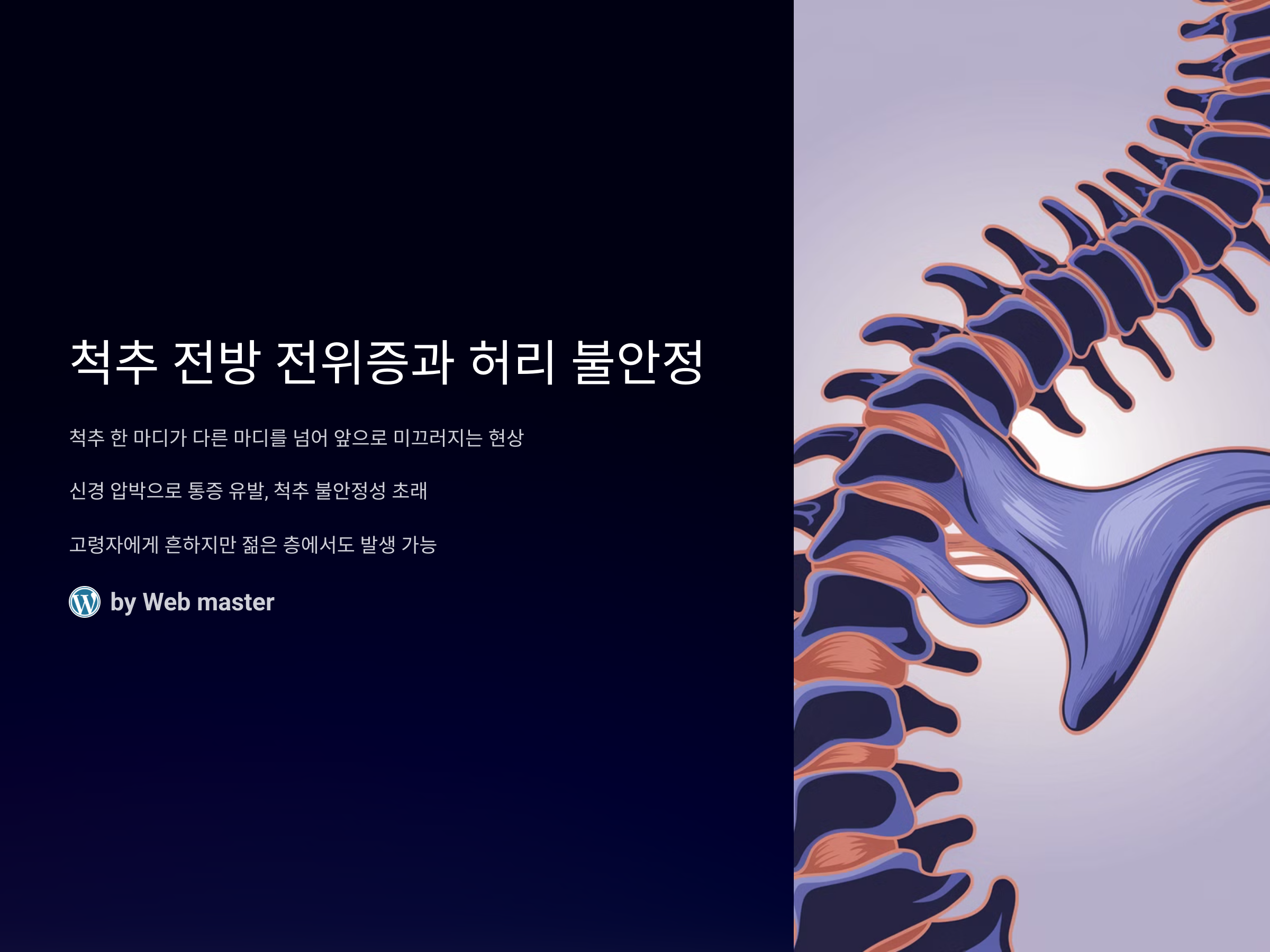 척추 전방 전위증(또는 척추 미끄러짐)은 현대인에게 점차 빈번하게 발생하는 척추 질환 중 하나입니다. 이 상태는 척추의 한 마디가 다른 마디를 넘어 앞으로 미끄러지는 현상을 의미합니다. 결과적으로, 신경에 압박을 가해 통증을 유발하거나 척추의 불안정성을 초래할 수 있습니다. 이 질환은 특히 허리 불안정을 유발하며, 증상에 따라 일상 생활에 큰 영향을 미칠 수 있습니다. 본 글에서는 척추 전방 전위증의 원인, 증상, 그리고 이를 관리하고 예방하기 위한 방법들을 다루어 보겠습니다.