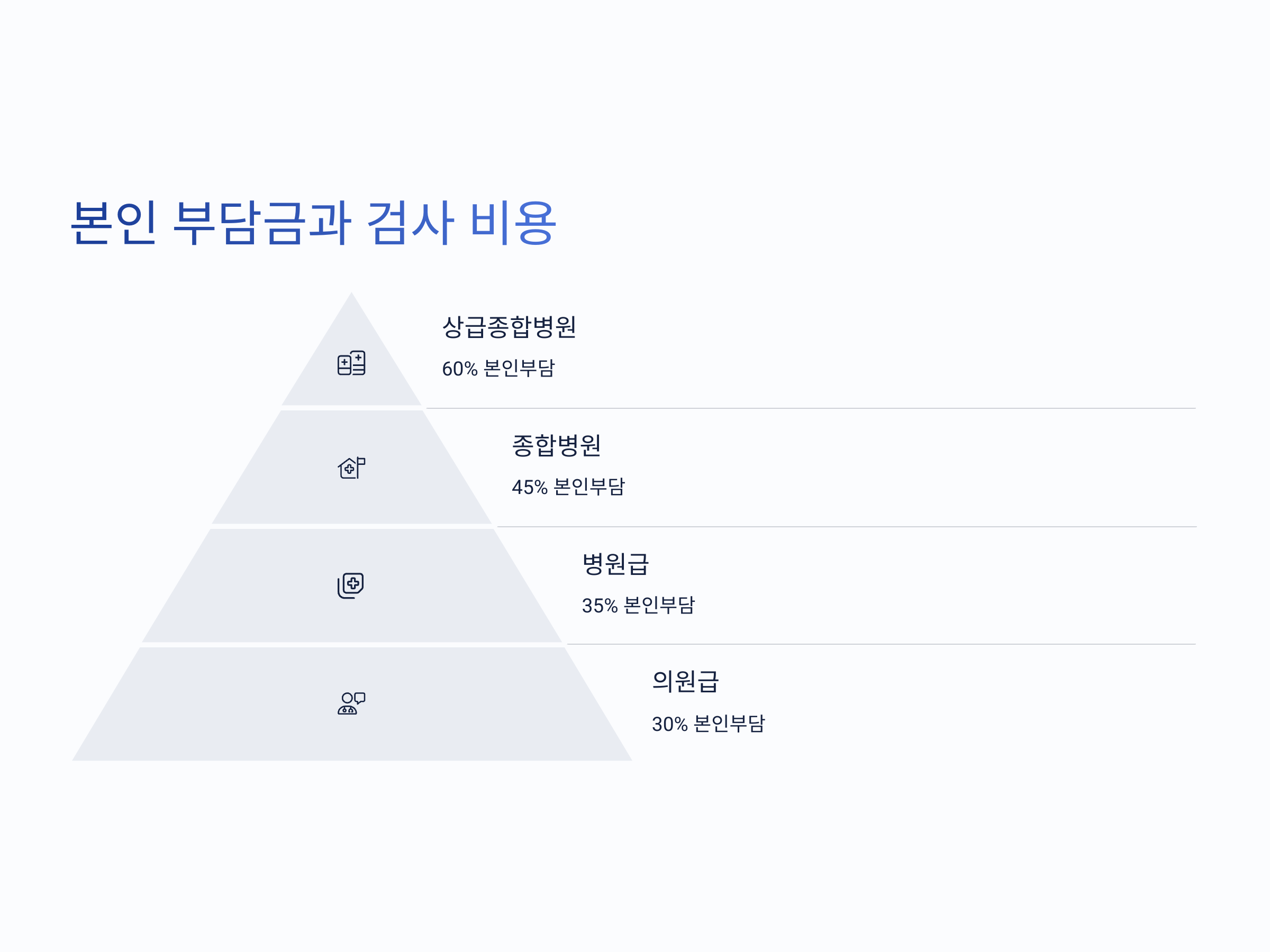 건강보험이 적용되는 경우에도 본인 부담금이 발생합니다. 일반적으로 상급종합병원에서는 검사비의 60%, 종합병원에서는 45%, 병원급 의료기관에서는 35%, 의원급에서는 30%를 본인이 부담해야 합니다. 예를 들어, 검사 비용이 100만 원인 경우 상급종합병원에서는 60만 원, 종합병원에서는 45만 원을 본인이 부담하게 됩니다. 이러한 본인 부담률은 의료기관의 종별에 따라 다르므로, 검사를 받기 전에 해당 병원의 본인 부담률을 확인하는 것이 좋습니다.