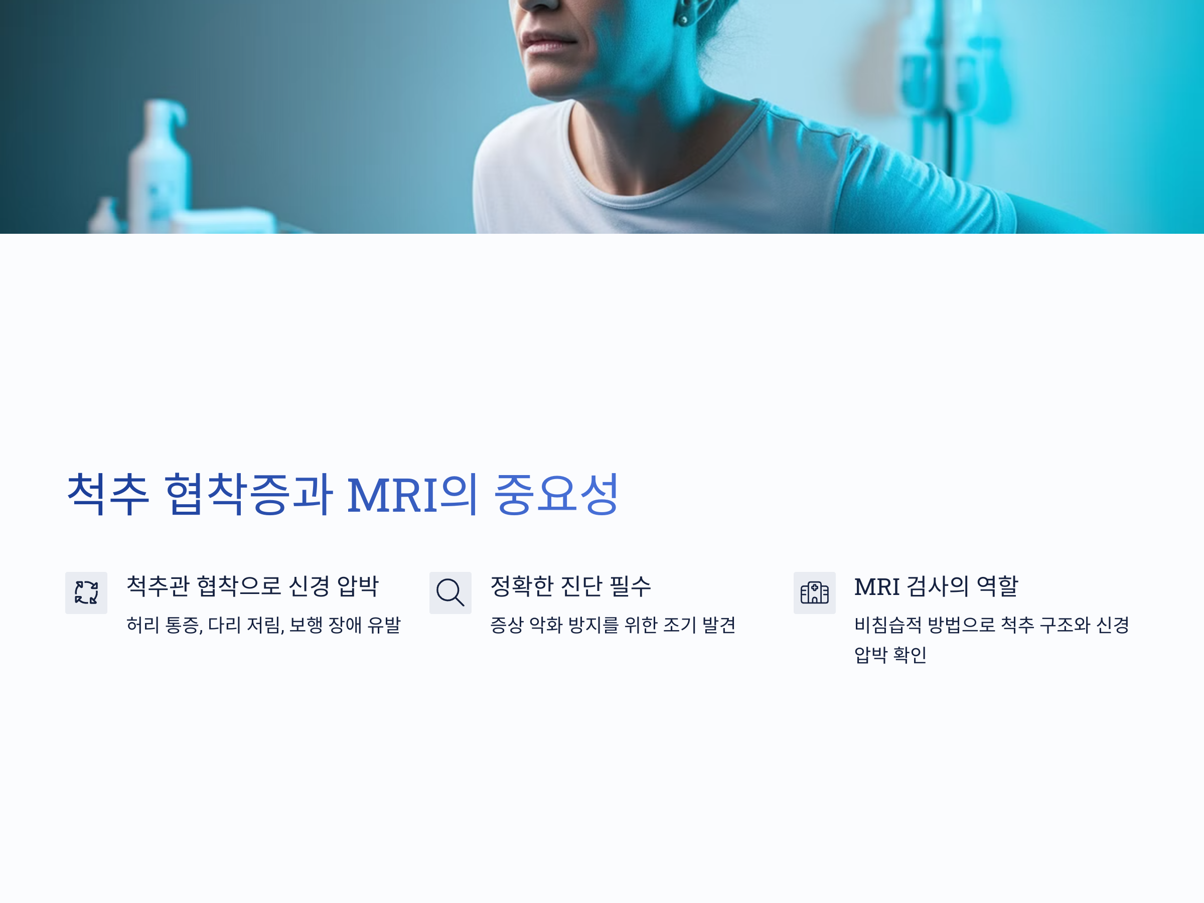 척추 협착증은 척추관이 좁아져 신경을 압박하는 질환으로, 허리 통증, 다리 저림, 보행 장애 등의 증상을 유발합니다. 이러한 증상은 일상생활의 질을 크게 저하시킬 수 있으며, 정확한 진단이 이루어지지 않으면 증상이 악화될 수 있습니다. MRI 검사는 척추의 구조와 신경 압박 정도를 상세하게 파악할 수 있는 비침습적 검사로, 척추 협착증의 진단과 치료 계획 수립에 필수적입니다.