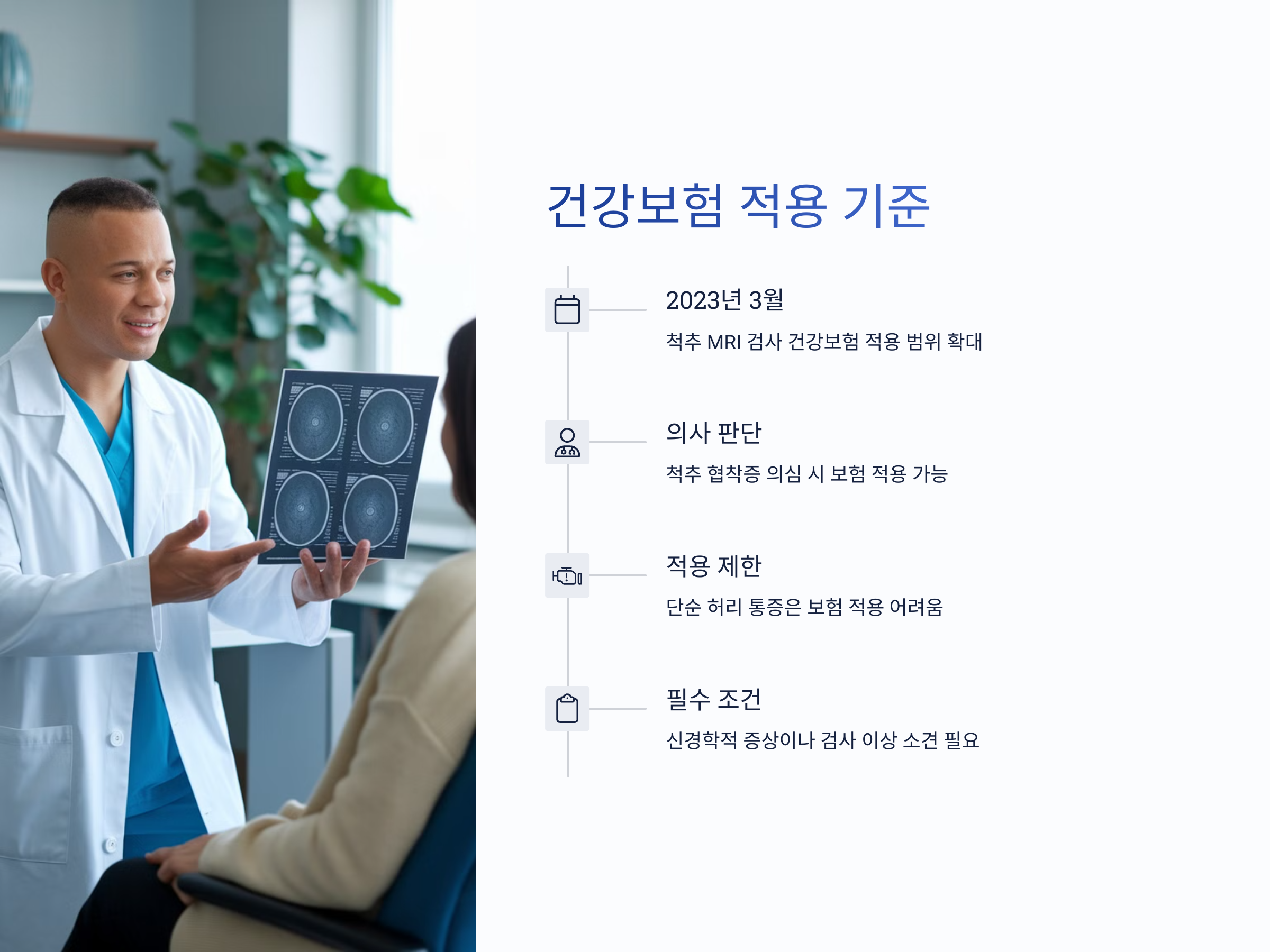 2023년 3월부터 보건복지부는 척추 MRI 검사의 건강보험 적용 범위를 확대하였습니다. 이에 따라, 의사의 판단 하에 척추 협착증이 의심되는 경우 건강보험 혜택을 받을 수 있습니다. 그러나 단순한 허리 통증만으로는 보험 적용이 어려우며, 신경학적 증상이나 다른 검사에서 이상 소견이 발견된 경우에만 적용됩니다. 따라서 MRI 검사가 필요하다고 판단되면, 의료진과 상담하여 건강보험 적용 가능 여부를 확인하는 것이 중요합니다.