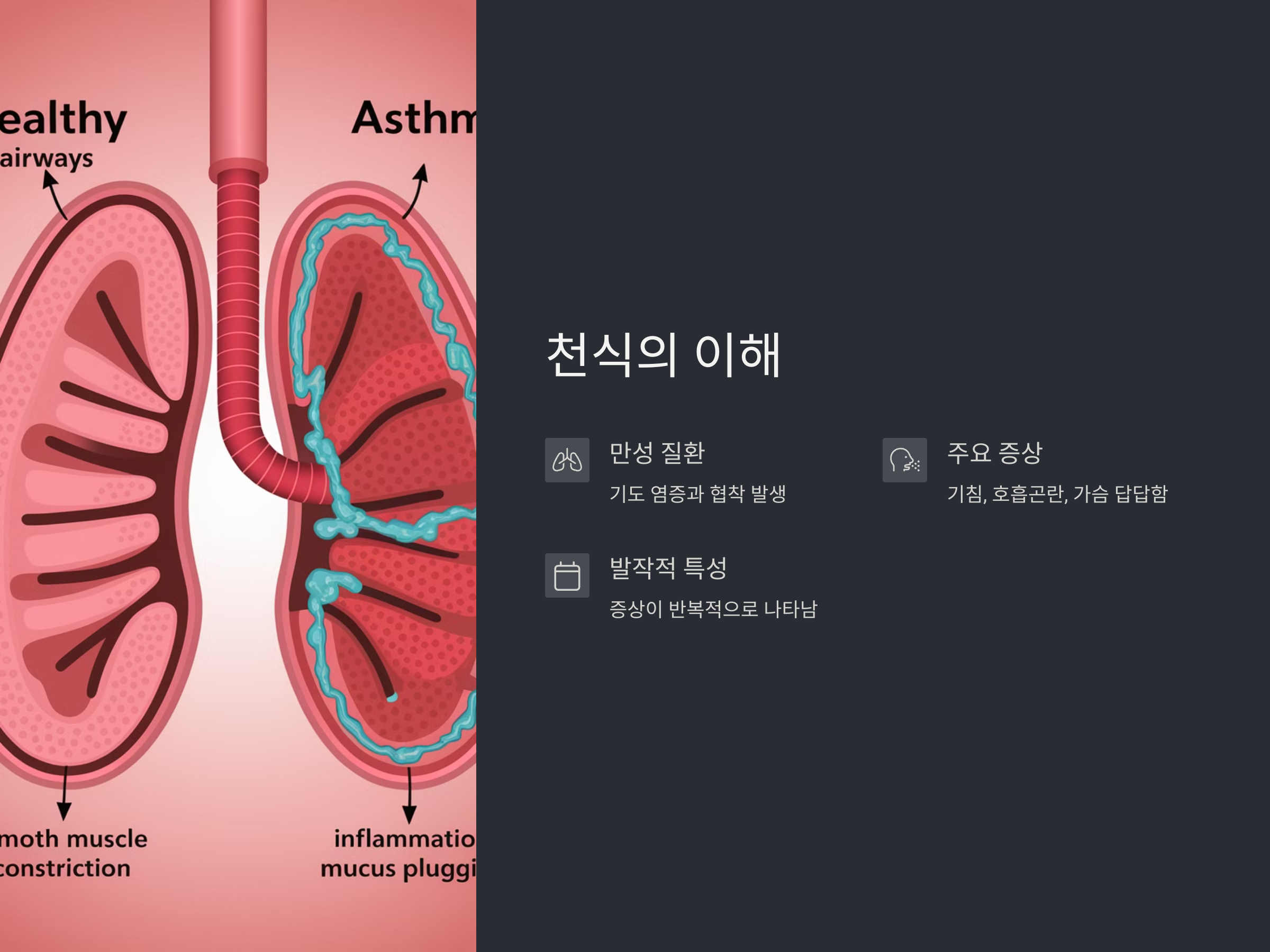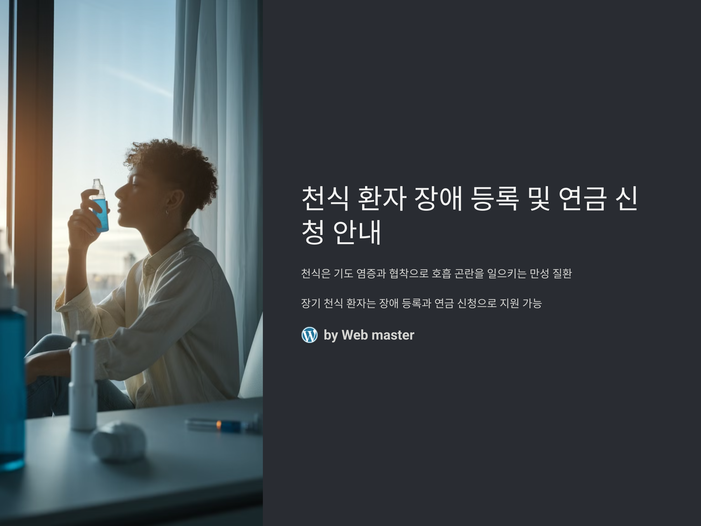 천식은 기도에 염증과 협착을 일으켜 호흡에 어려움을 주는 만성 질환입니다. 이 질환은 발작적으로 증상이 나타나며, 기침, 호흡곤란, 가슴 답답함 등의 증상이 반복적으로 나타날 수 있습니다. 천식을 장기적으로 앓고 있는 환자들은 일상생활에서 많은 불편함을 겪고 있으며, 이에 따라 장애 등록과 장애 연금 신청을 통해 필요한 지원을 받을 수 있습니다.