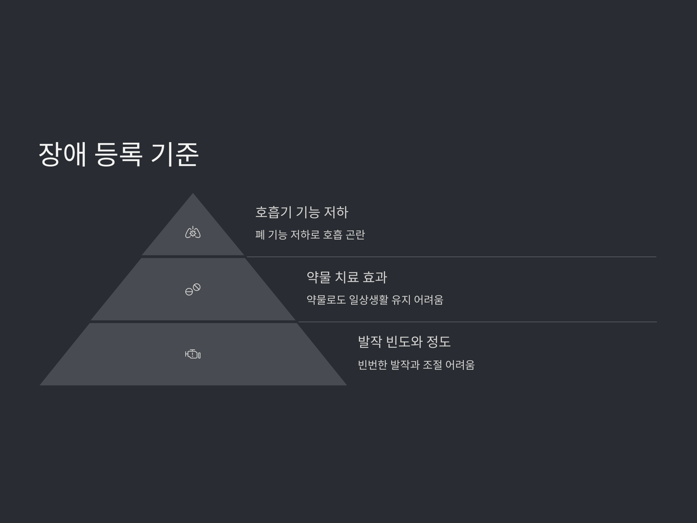 장기 천식 환자가 장애 등록을 하려면, 일반적으로 '장애인 복지법'에 따라 일정 기준을 충족해야 합니다. 특히 천식 환자의 경우, 그 심각도와 일상생활에 미치는 영향을 바탕으로 장애등급이 결정됩니다. 천식이 장애로 등록될 수 있는 기준은 다음과 같습니다: