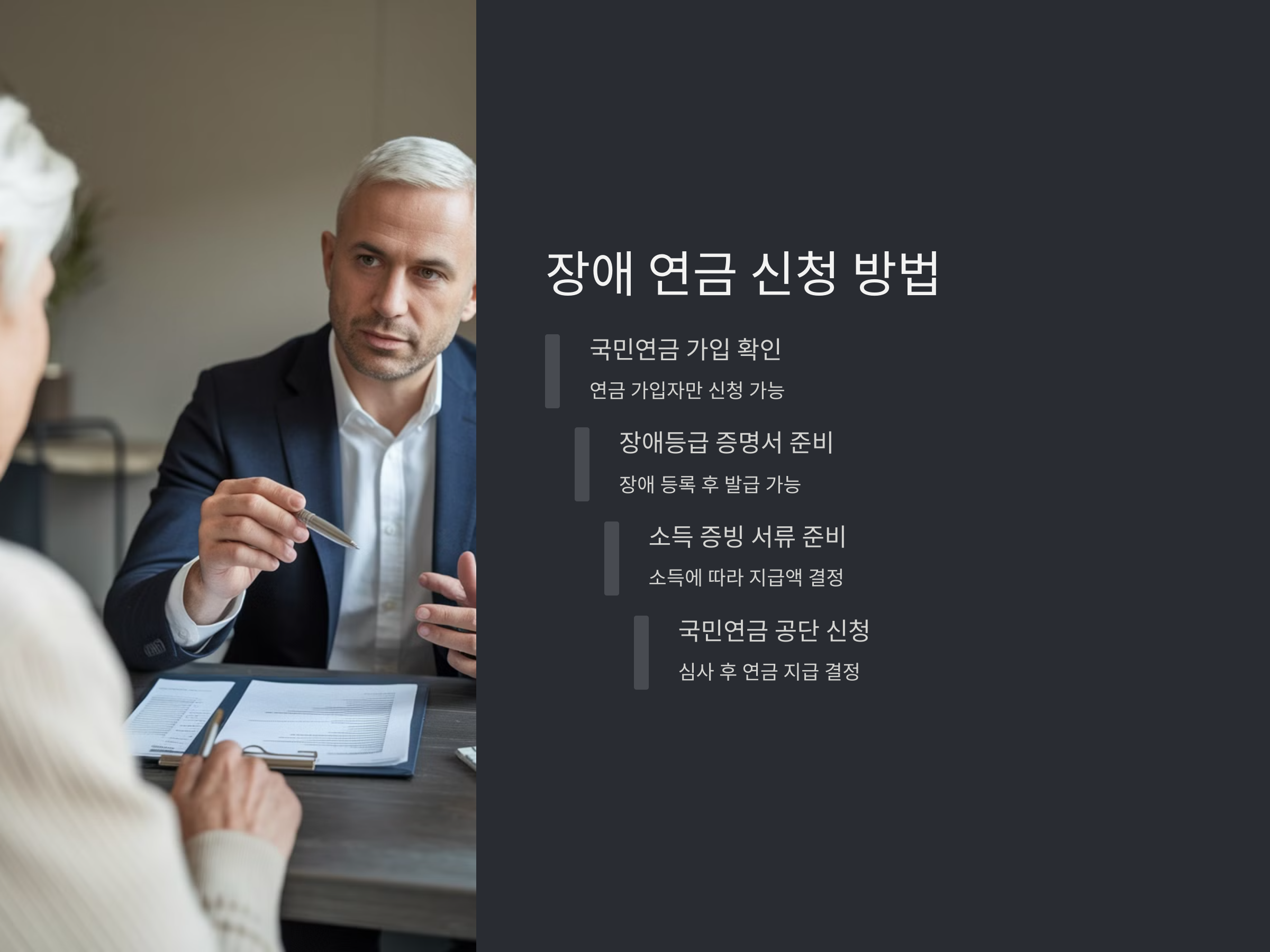 - 장애등급 증명서 제출: 장애 연금을 신청하려면 장애등급 증명서를 제출해야 합니다. 이 증명서는 장애 등록 후 발급받을 수 있습니다.