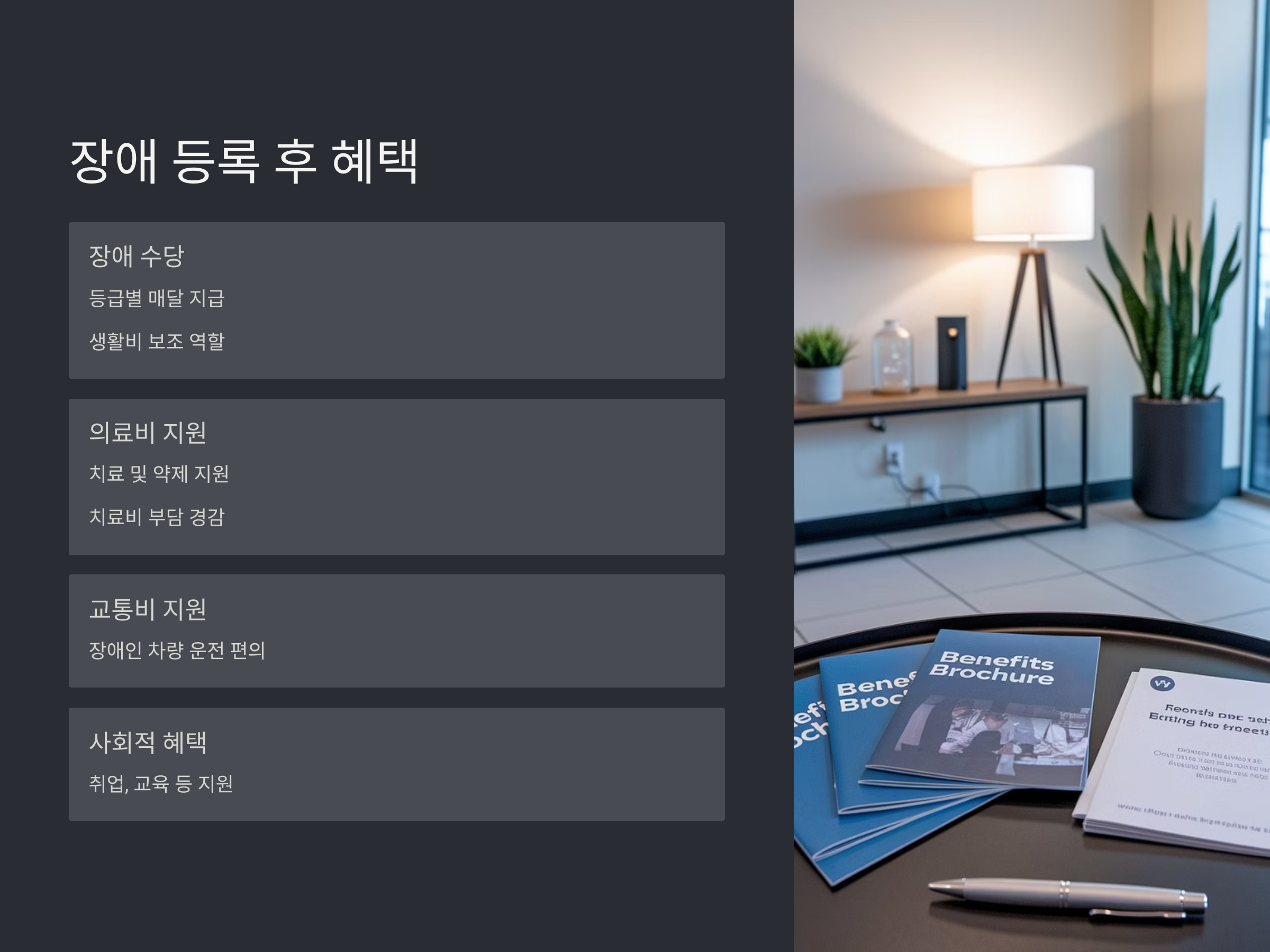 - 사회적 혜택: 장애 등록을 통해 취업, 교육 등 다양한 사회적 혜택을 제공받을 수 있습니다.
