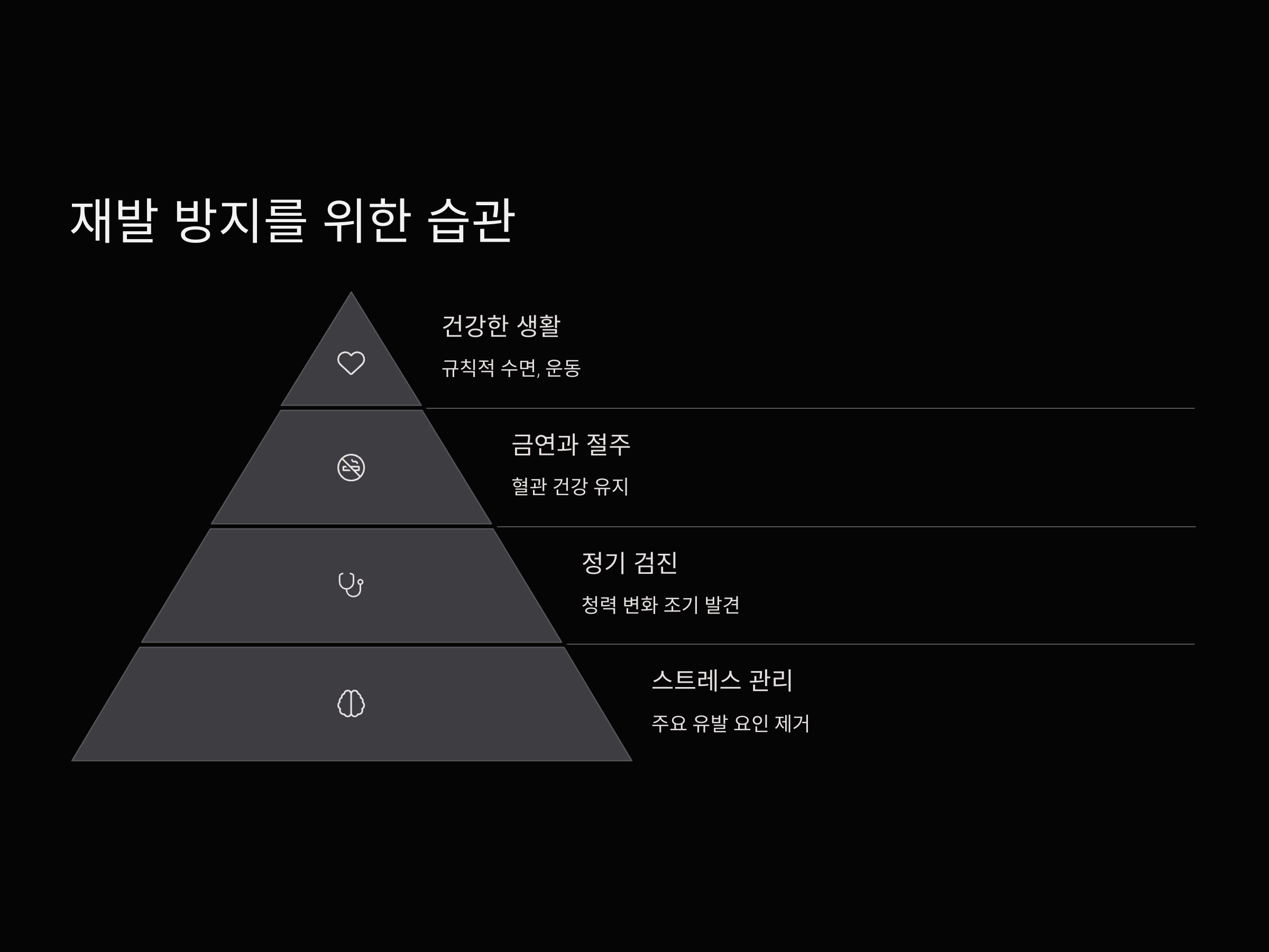 돌발성 난청 치료 후에도 재발 방지를 위해 일상적인 관리가 매우 중요합니다. 가장 먼저 실천할 수 있는 것은 스트레스 관리입니다. 스트레스는 돌발성 난청의 주요 유발 요인 중 하나로, 수면 부족과 불규칙한 생활은 청신경에 악영향을 줄 수 있습니다.