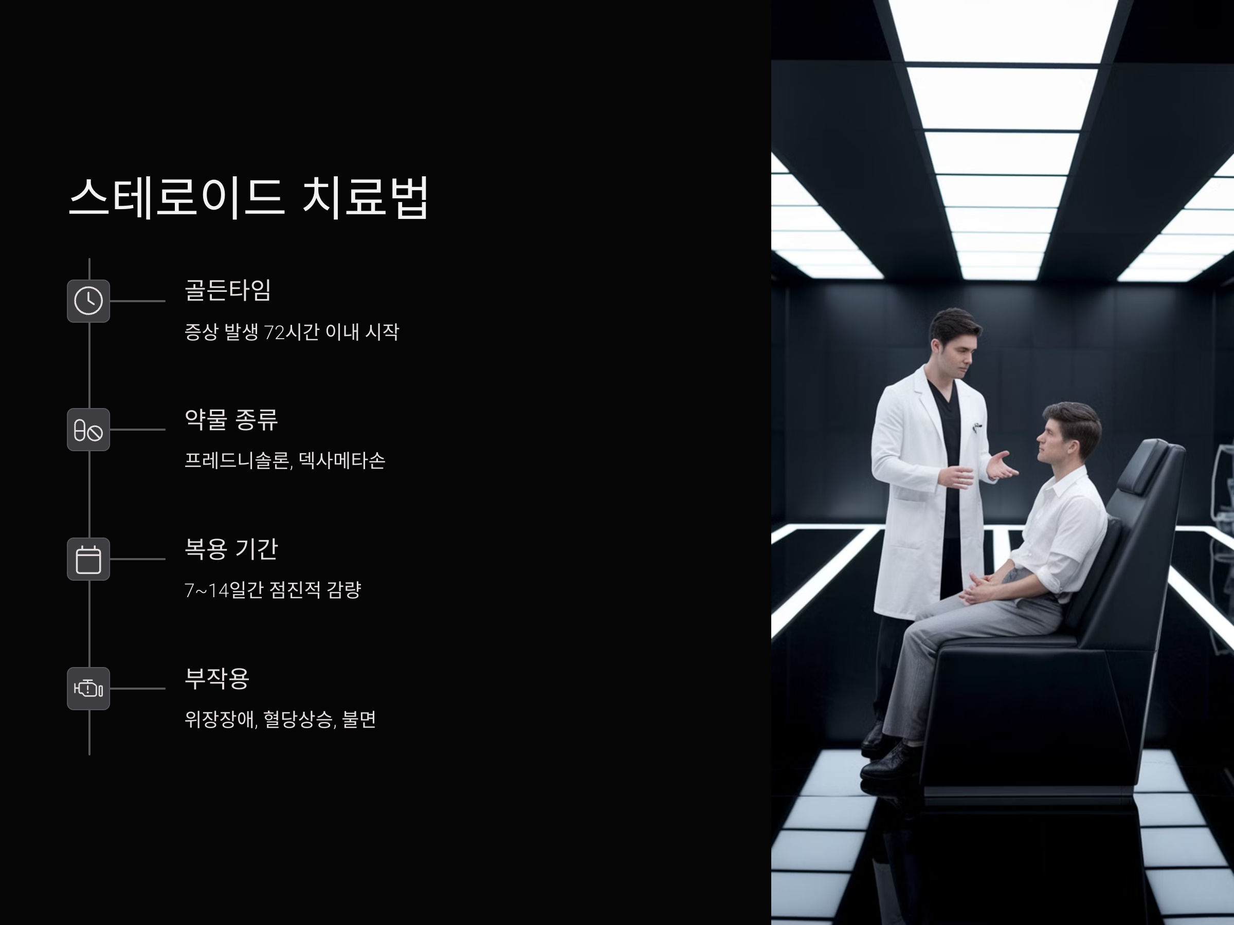 복용 시기는 빠를수록 좋습니다. 증상이 나타난 후 3일 이내 스테로이드를 투여해야 회복률이 높아지며, 일반적으로 7~14일 동안 점진적으로 용량을 줄이며 복용합니다. 그러나 고용량 스테로이드를 복용할 경우 위장 장애, 혈당 상승, 불면 등의 부작용이 있을 수 있으므로 의사의 처방 아래 정확한 용법을 따르는 것이 필수입니다.