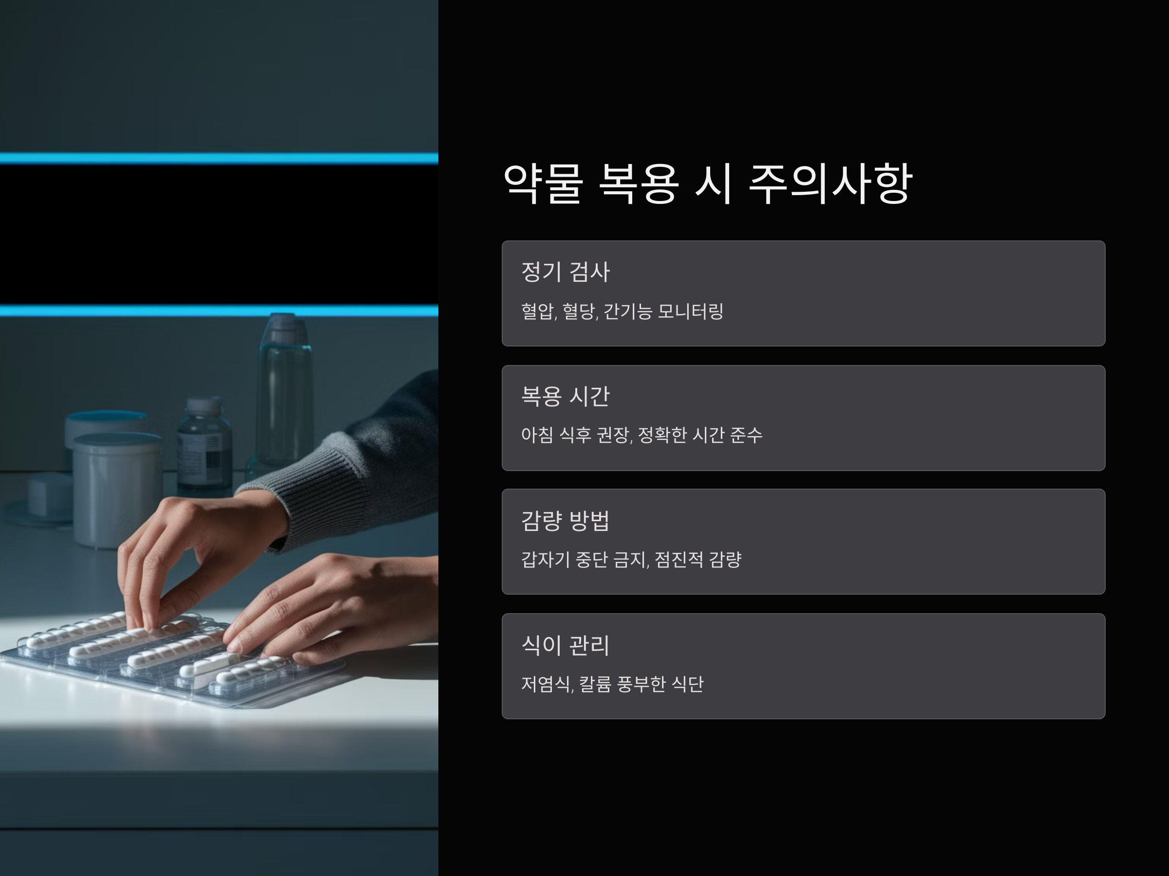 약 복용 시간은 일반적으로 아침 식후가 권장되며, 스테로이드는 부작용을 최소화하기 위해 복용 시간과 용량을 정확하게 지켜야 합니다. 또한 약을 갑자기 끊지 말고, 의사의 지시에 따라 점진적으로 감량해야 부작용을 방지할 수 있습니다.