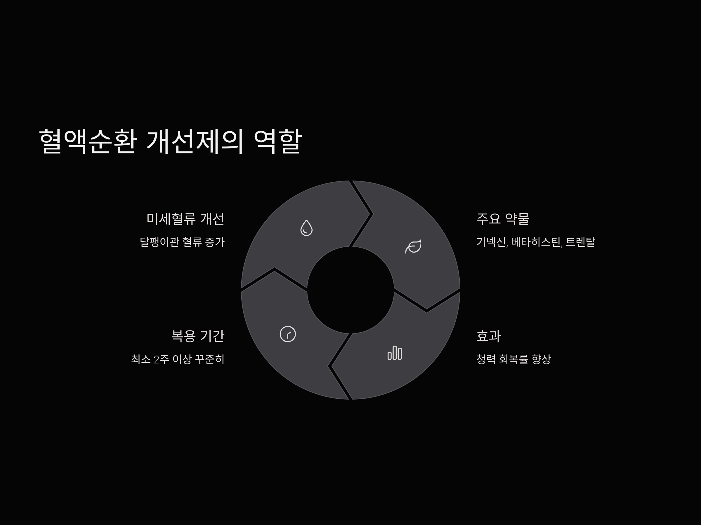 혈액순환 개선제는 달팽이관의 미세혈류를 개선하여 손상된 청신경에 산소와 영양소 공급을 원활하게 하도록 돕습니다. 대표적으로 사용하는 약물은 기넥신(Gingko Biloba Extract), 베타히스틴, 트렌탈(펜톡시필린) 등이 있으며, 이들은 청력 회복률을 높이는 보조적 역할을 합니다.