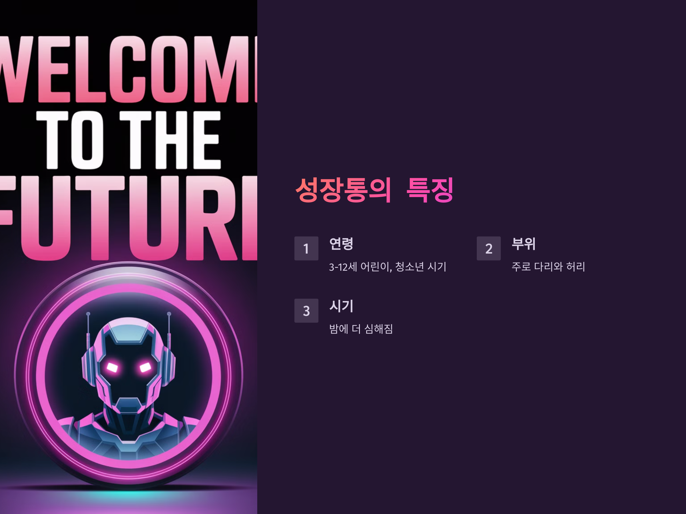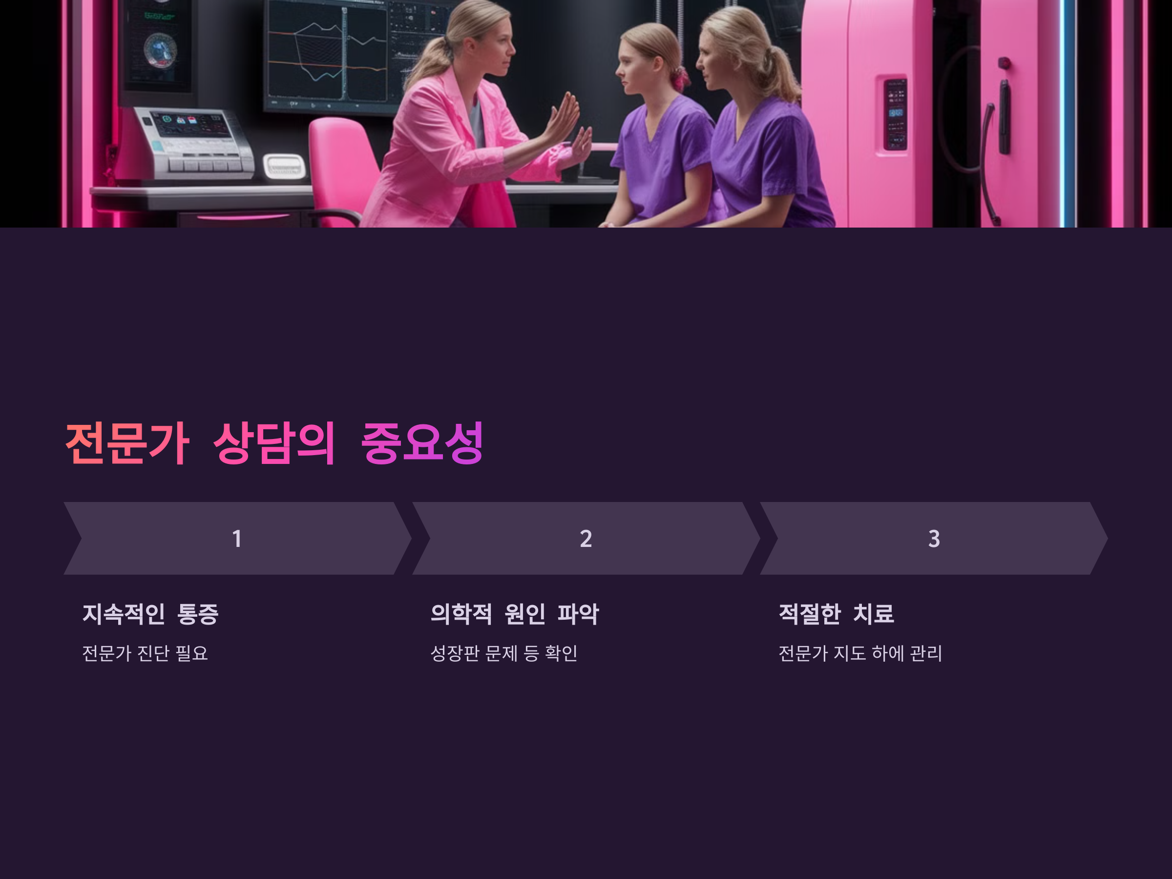 만약 통증이 지속되거나 심해지면, 전문가의 진단을 받는 것이 필요합니다. 성장판 문제나 기타 의학적인 원인이 있을 수 있기 때문에, 의료 전문가와 상담하여 적절한 치료를 받는 것이 중요합니다.