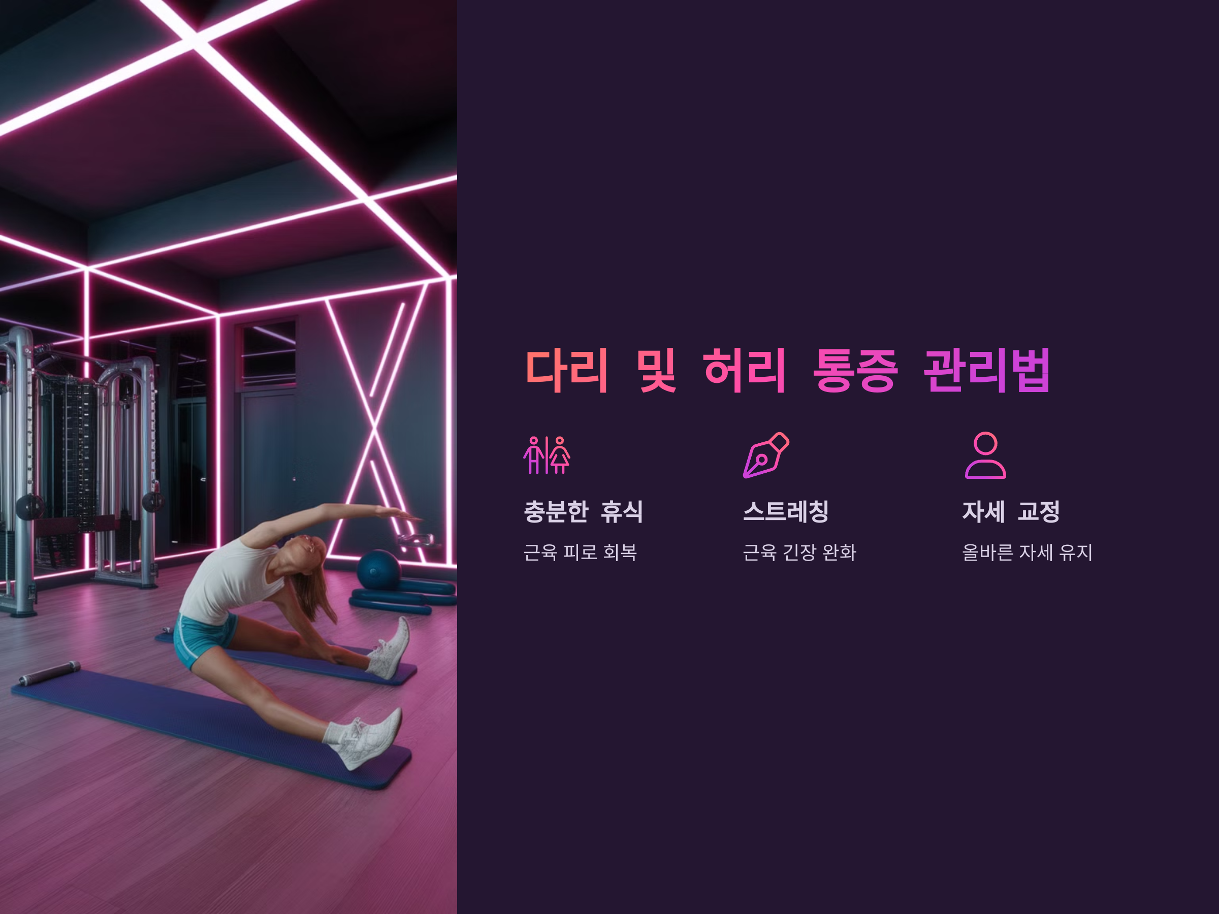 근육통을 완화하려면 적절한 휴식과 스트레칭이 중요합니다. 운동 후 충분히 휴식을 취하고, 근육의 긴장을 풀어주는 스트레칭을 꾸준히 하여 근육을 부드럽게 만들어야 합니다. 또한, 다리와 허리 근육을 풀어주는 마사지를 받는 것도 효과적인 방법입니다.