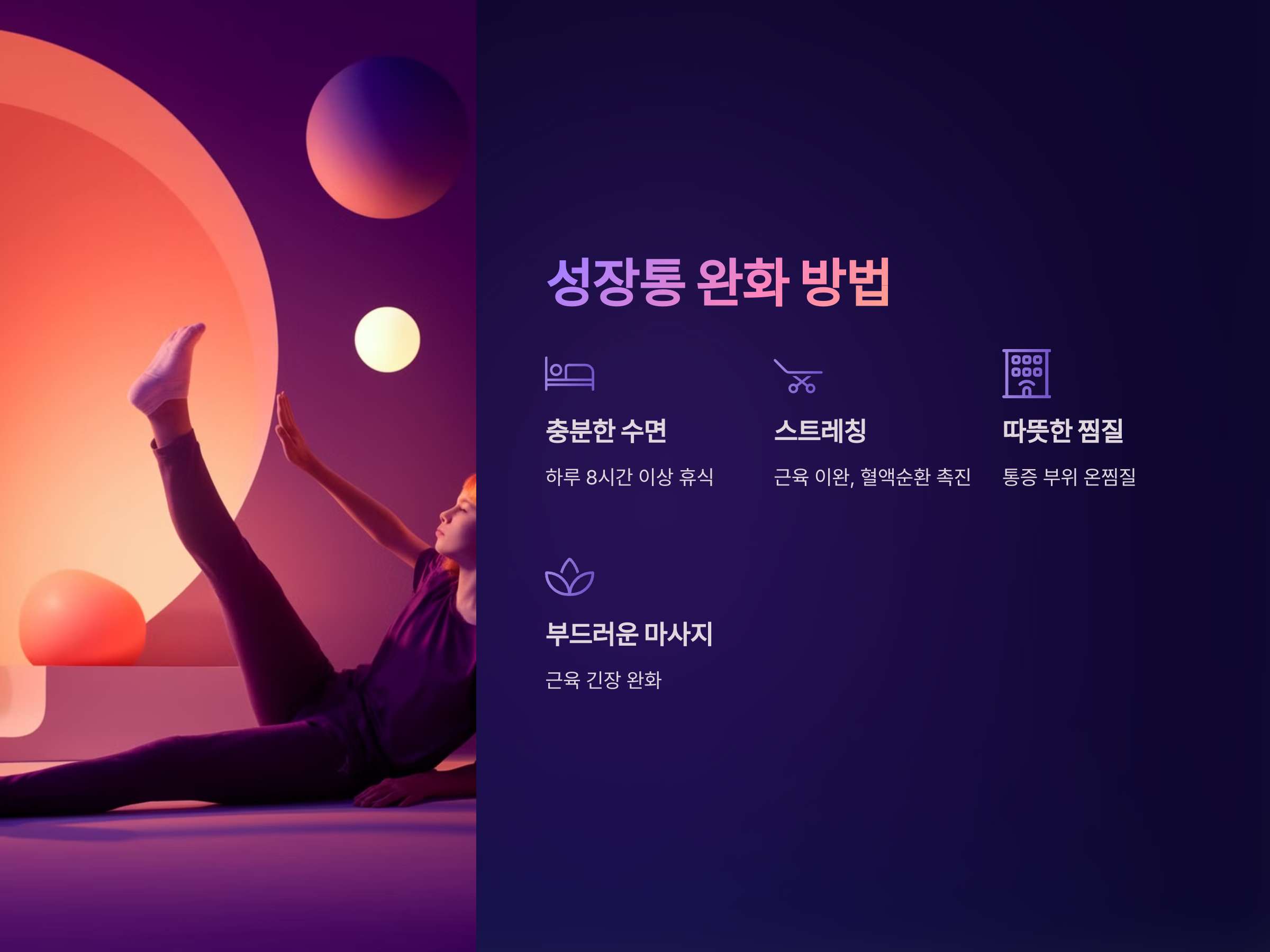 칼슘과 마그네슘 보충 외에도 성장통을 완화할 수 있는 다양한 방법이 있습니다. 아래는 몇 가지 효과적인 방법입니다.