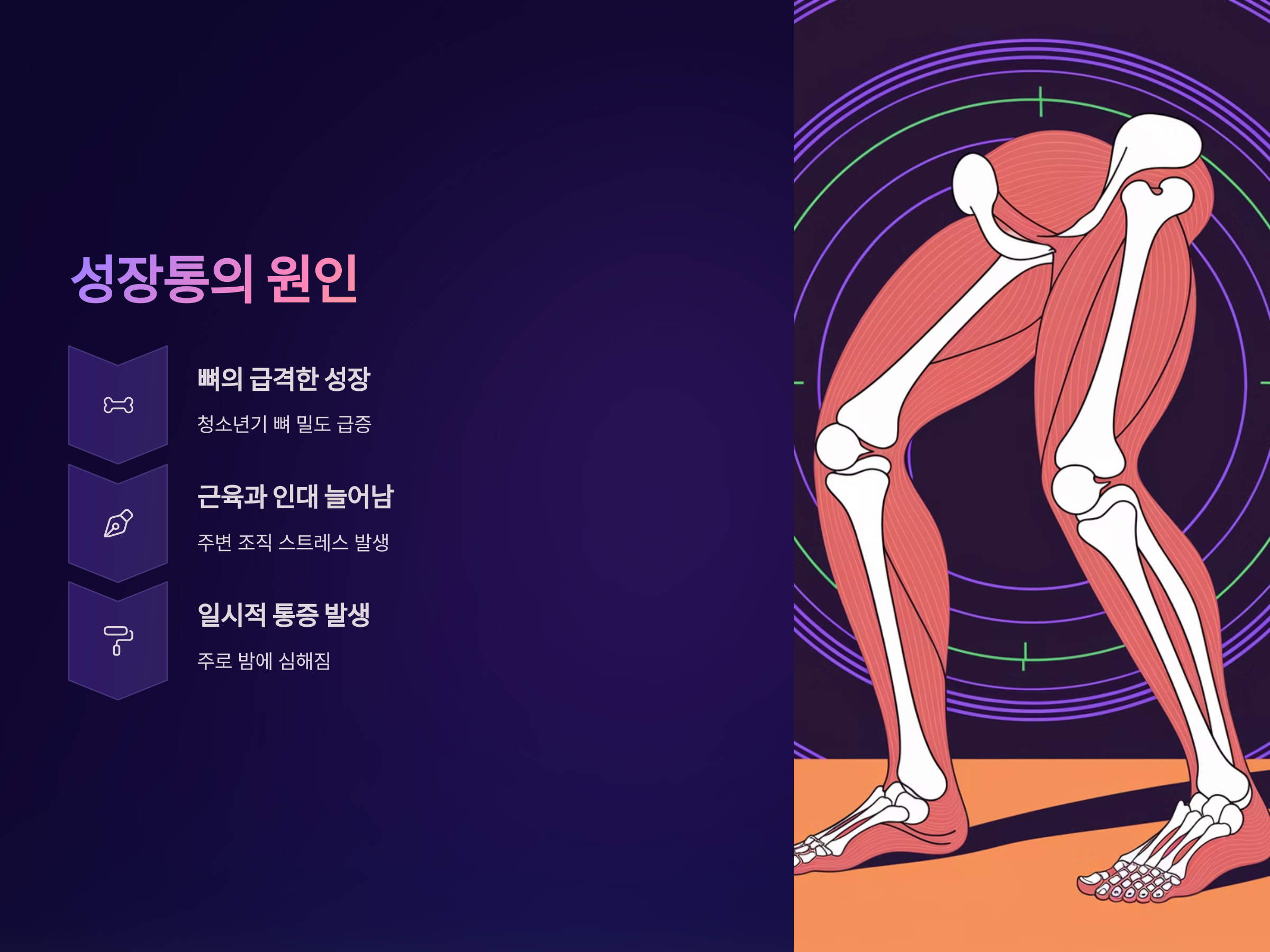 청소년들이 성장하면서 겪는 성장통은 일시적인 통증으로, 주로 뼈와 근육의 급격한 성장이 원인입니다. 뼈가 급격하게 자라면서 주변 근육과 인대가 늘어나기 때문에 통증을 느끼는 것입니다. 이때 칼슘과 마그네슘은 신체의 성장과 뼈 건강에 중요한 역할을 합니다.