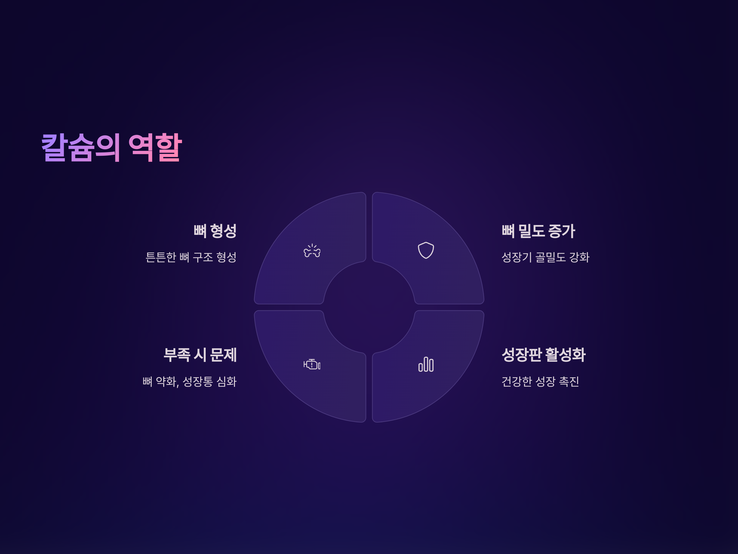 - 칼슘은 뼈를 강화하는 주된 역할을 하며, 성장판이 활발하게 자라는 동안 뼈의 밀도를 높이는 데 기여합니다. 칼슘이 부족하면 뼈가 약해지고, 성장통이 심해질 수 있습니다.