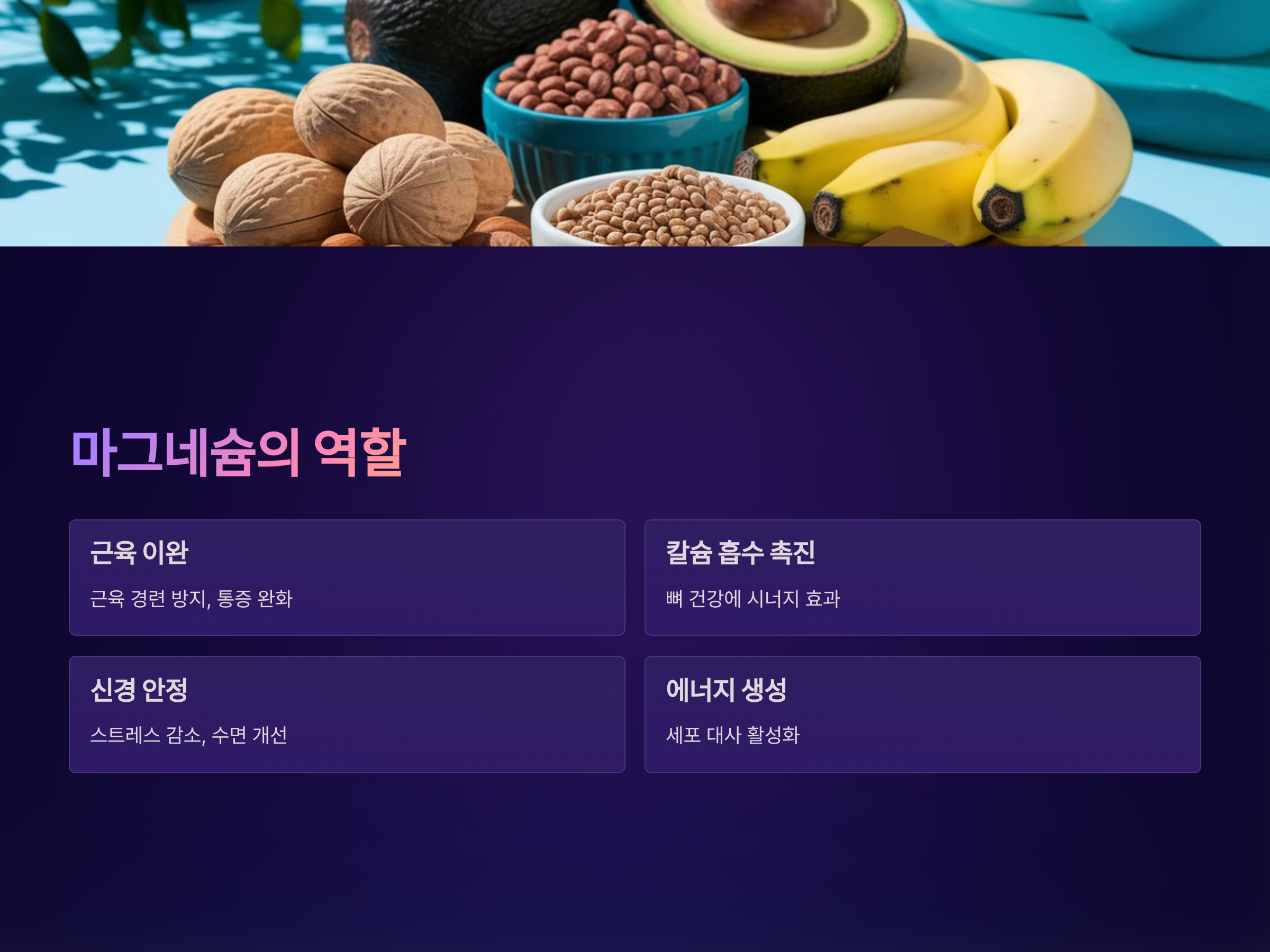 - 마그네슘은 근육을 이완시키는 역할을 합니다. 마그네슘이 부족하면 근육 경련이 발생할 수 있으며, 이는 성장통을 더욱 심하게 만들 수 있습니다. 마그네슘은 칼슘이 뼈에 잘 흡수되도록 돕는 역할도 하여, 두 미네랄의 균형이 중요합니다.