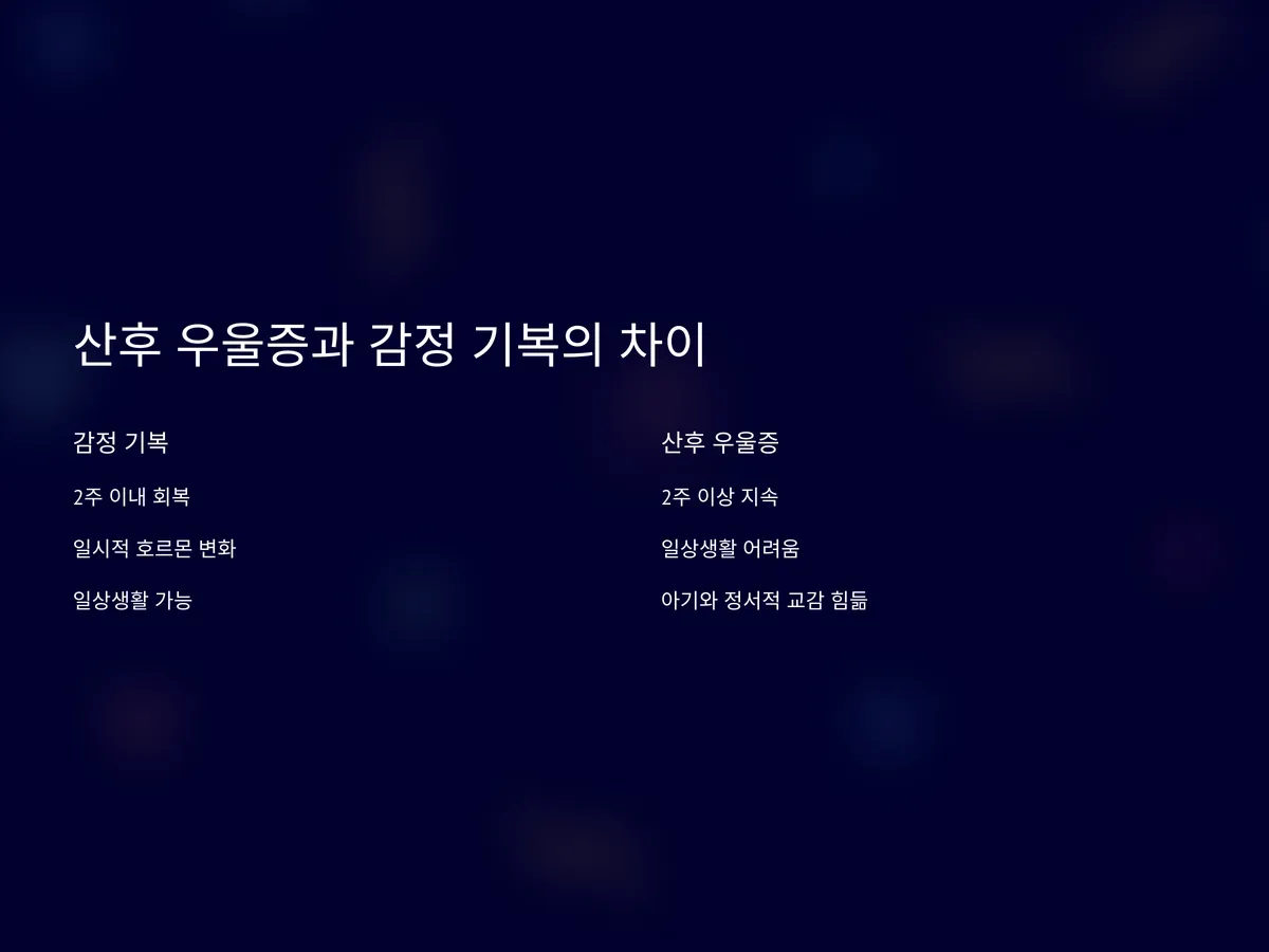 많은 사람들이 산후 우울증과 단순한 감정 기복을 헷갈리기 쉽지만, 실제로는 그 지속성과 강도에서 큰 차이를 보입니다. 감정 기복은 일시적인 호르몬 변화와 피로에 의해 일어나며, 대체로 2주 이내로 회복되는 경우가 많습니다. 반면 산후 우울증은 그 감정이 2주 이상 지속되며 일상생활에 지장을 줄 만큼 심각한 수준이 됩니다.