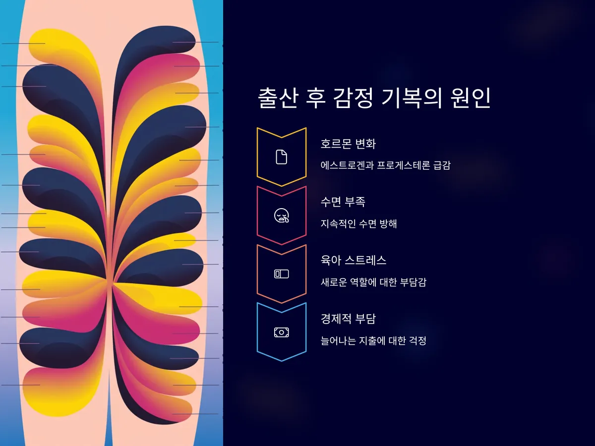 출산 직후 여성의 몸은 호르몬이 급격하게 변하며 생리적인 균형이 무너지게 됩니다. 임신 기간 동안 급증했던 에스트로겐과 프로게스테론이 출산 후 빠르게 감소하면서 뇌의 신경전달 물질에도 영향을 미치게 되는데, 이로 인해 감정 조절이 어려워지고 우울감, 불안, 짜증, 눈물 등이 빈번해집니다.
