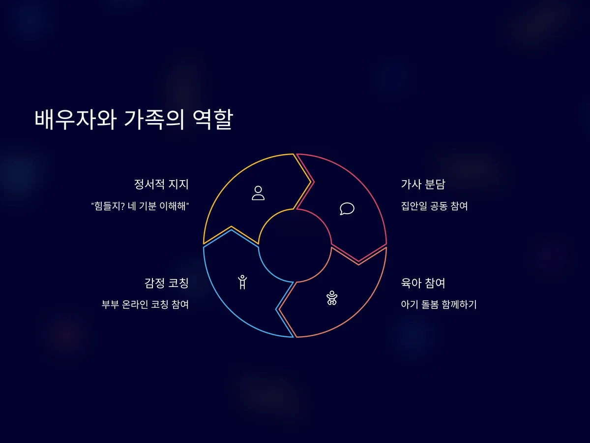 산후 감정 기복과 우울증을 겪는 이 시기, 가족의 태도는 회복 속도를 결정짓는 가장 큰 요인 중 하나입니다. 배우자가 "네가 너무 예민한 거 아니야?"라는 식의 반응을 보인다면 상황은 더욱 악화됩니다. 정서적 지지와 가사 및 육아의 공동 참여는 반드시 필요합니다.
