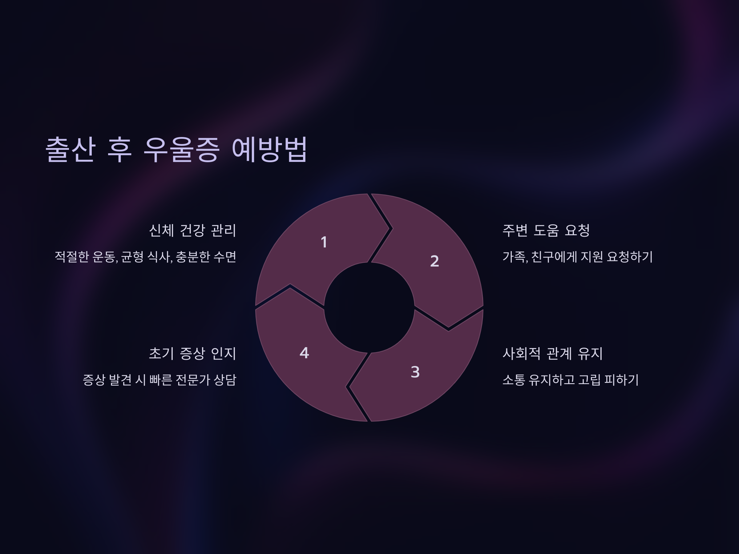 출산 후 우울증을 예방하기 위해서는 무엇보다 자신의 건강을 먼저 챙기는 것이 중요합니다. 육아와 가사로 바쁜 일정을 보내고 있더라도, 본인의 건강과 정신적 안정을 위해 시간을 투자해야 합니다. 적절한 운동, 균형 잡힌 식사, 충분한 수면은 모두 출산 후 우울증을 예방하는 데 도움이 됩니다.