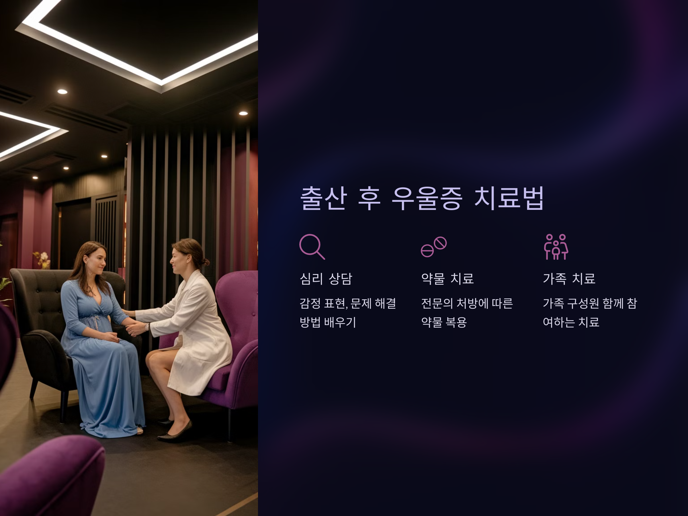 출산 후 우울증을 극복하는 방법은 여러 가지가 있지만, 가장 중요한 것은 전문가의 상담과 치료입니다. 정신건강복지센터에서 제공하는 상담 서비스 외에도, 병원에서의 심리상담, 약물 치료, 가족 치료 등이 도움이 될 수 있습니다.