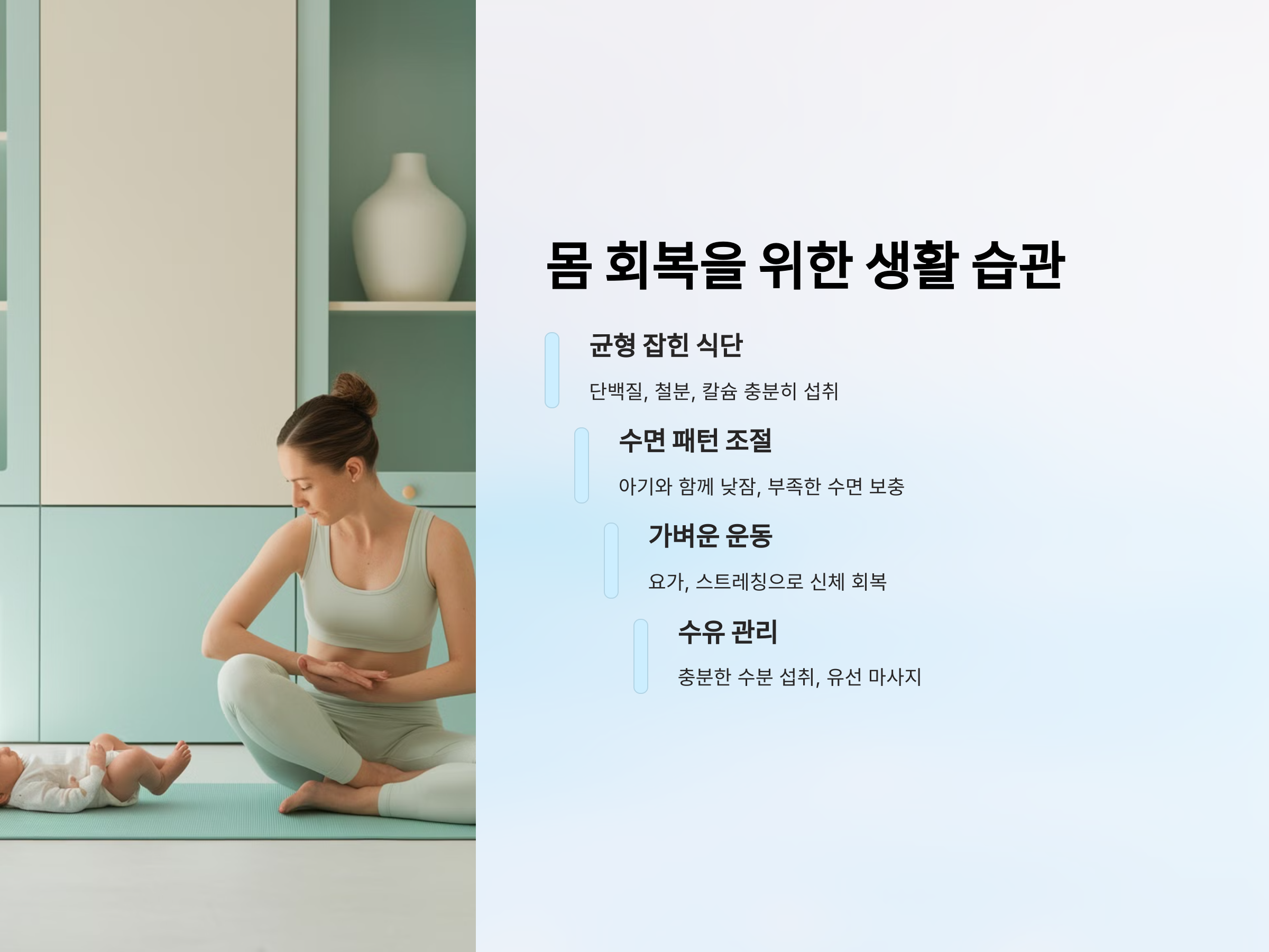 출산 후 몸을 빠르게 회복하려면 생활 습관을 관리하는 것이 중요합니다.