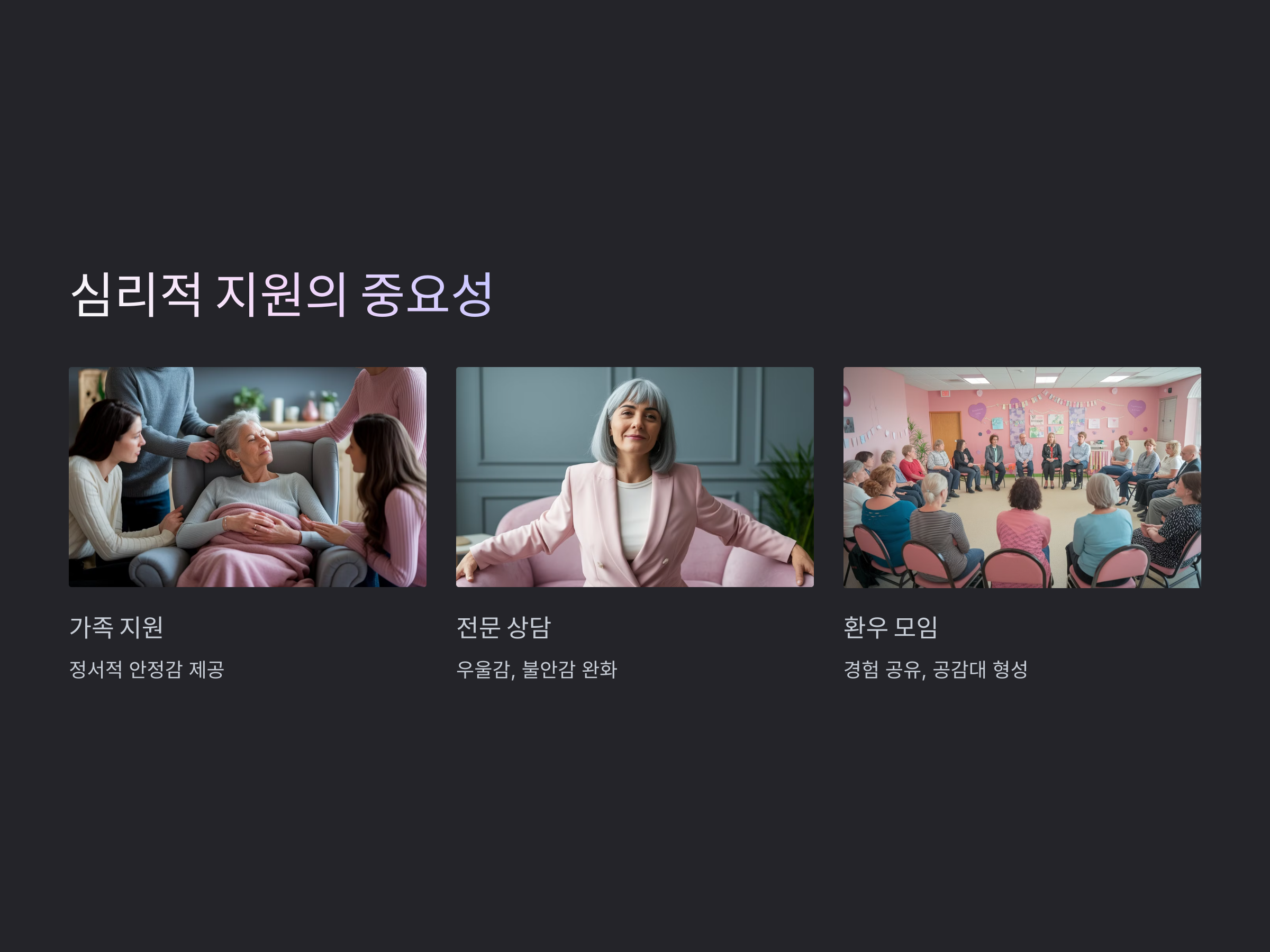 심리적 지원은 환자가 치료에 적극적으로 참여하고, 긍정적인 마음가짐을 유지하는 데 중요한 역할을 합니다. 치료의 과정에서 환자가 겪는 감정적 어려움을 이야기하고 공유할 수 있는 기회를 가지는 것이 좋습니다. 정기적인 심리상담과 함께 마음을 안정시키는 활동도 도움이 될 수 있습니다.