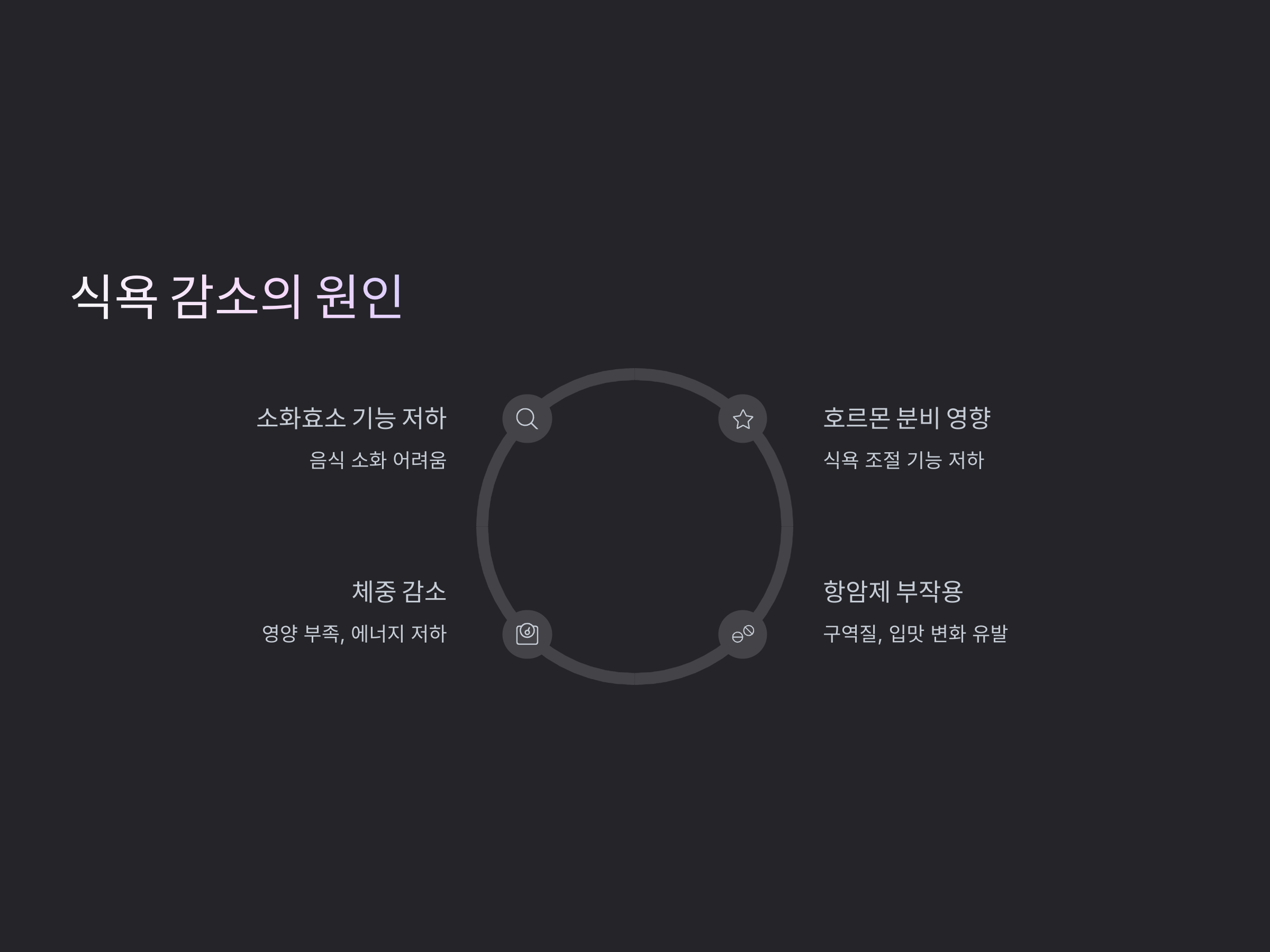 또한, 암 치료 과정 중에는 항암제나 방사선 치료로 인해 구역질이나 입맛의 변화가 생길 수 있습니다. 이러한 변화들은 환자가 음식을 섭취하는 데 어려움을 겪게 하며, 체중 감소와 영양 부족으로 이어질 수 있습니다. 식욕 감소는 또한 몸의 에너지 수준을 낮추고, 환자의 회복력에도 영향을 미칠 수 있습니다.