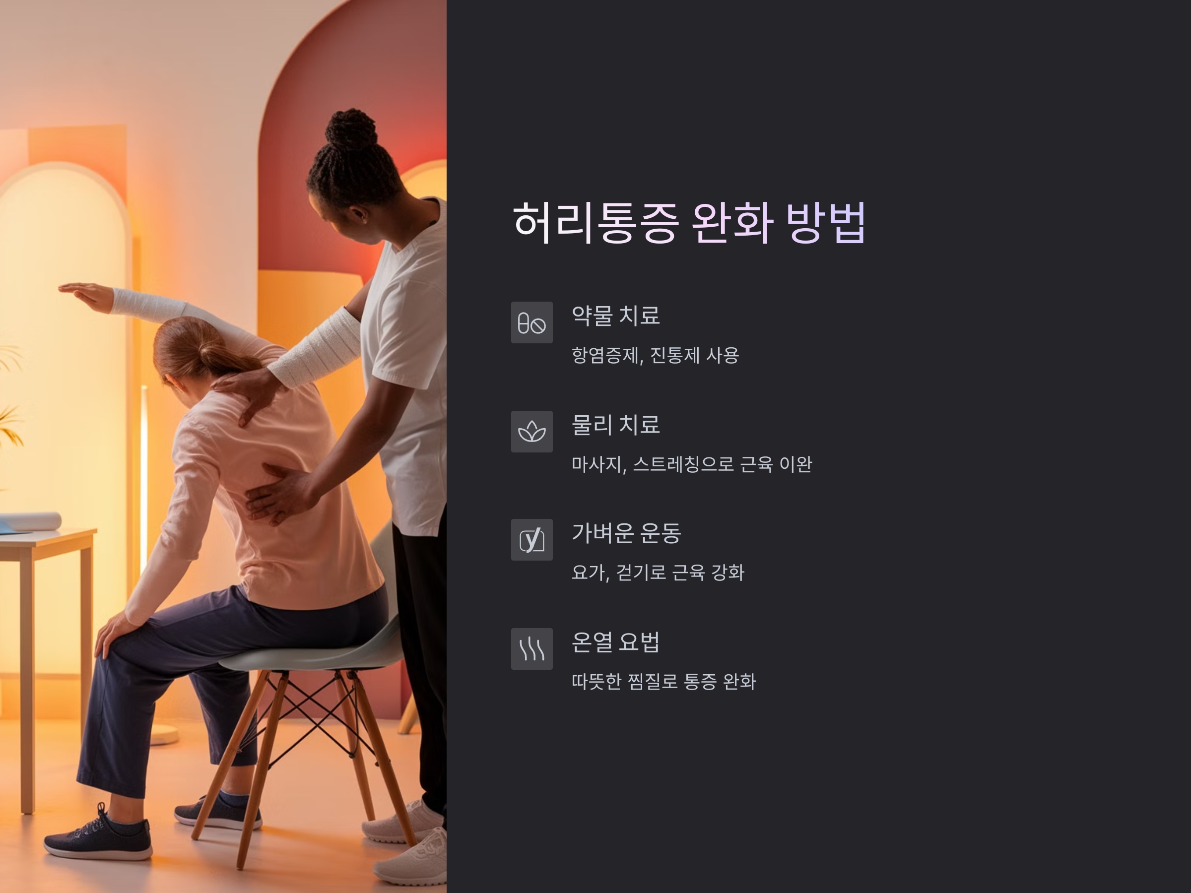 허리통증과 식욕 감소를 완화하기 위한 실천 방법에는 여러 가지가 있습니다. 첫째, 물리치료나 운동을 통해 허리의 근육을 강화하고, 통증을 완화할 수 있습니다. 가벼운 스트레칭이나 요가는 허리 통증을 줄이는 데 도움이 될 수 있으며, 운동은 전반적인 신체 건강을 유지하는 데 중요합니다. 둘째, 통증 완화를 위한 약물 치료를 통해 통증을 관리하고, 이를 통해 환자가 일상적인 활동을 수행할 수 있도록 돕습니다.