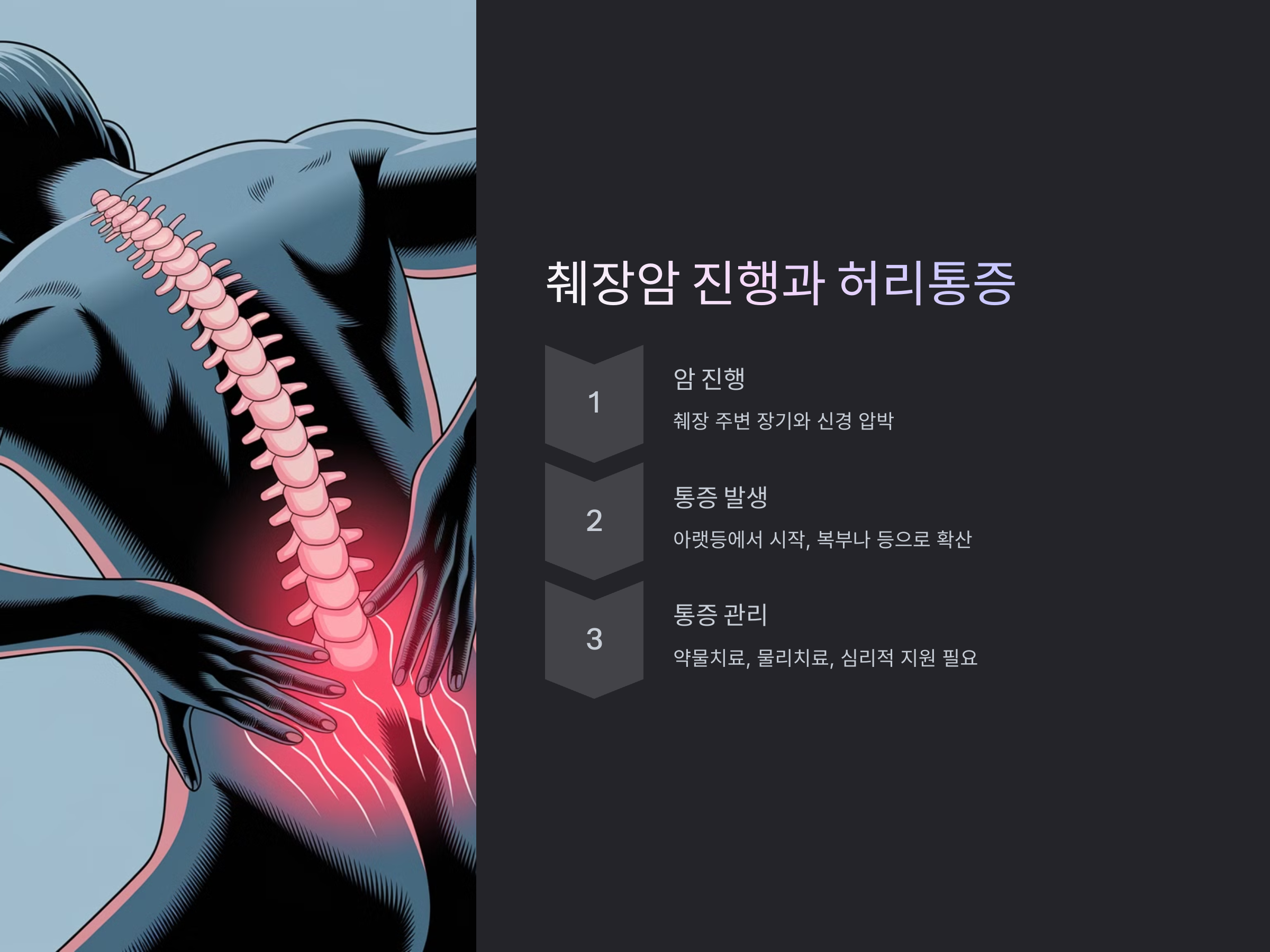 허리통증이 심한 경우, 통증 관리 방법을 찾는 것이 중요합니다. 약물치료, 물리치료, 심리적 지원 등 다양한 방법이 있으며, 전문가의 조언을 받는 것이 필수적입니다. 일부 환자는 암의 치료를 받으며 통증이 완화되는 경우도 있지만, 대부분은 통증을 관리하기 위한 지속적인 치료가 필요합니다.