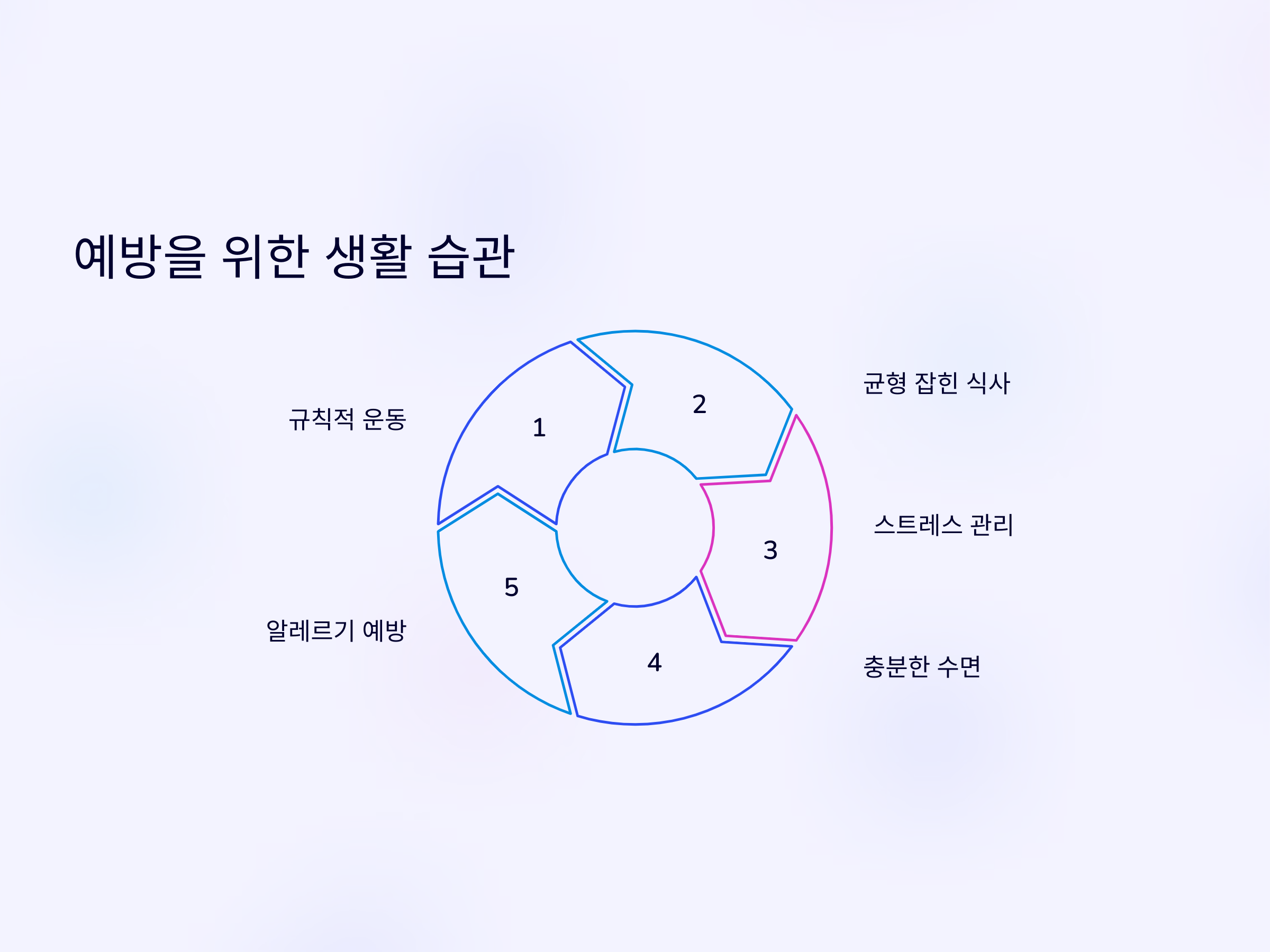 후비루를 예방하기 위해서는 평소에 건강한 생활 습관을 유지하는 것이 중요합니다. 규칙적인 운동과 균형 잡힌 식사를 통해 면역력을 강화하고, 스트레스를 줄이며 충분한 수면을 취하는 것이 도움이 됩니다. 또한, 알레르기 성향이 있는 경우 미리 예방적인 조치를 취하는 것이 좋습니다.