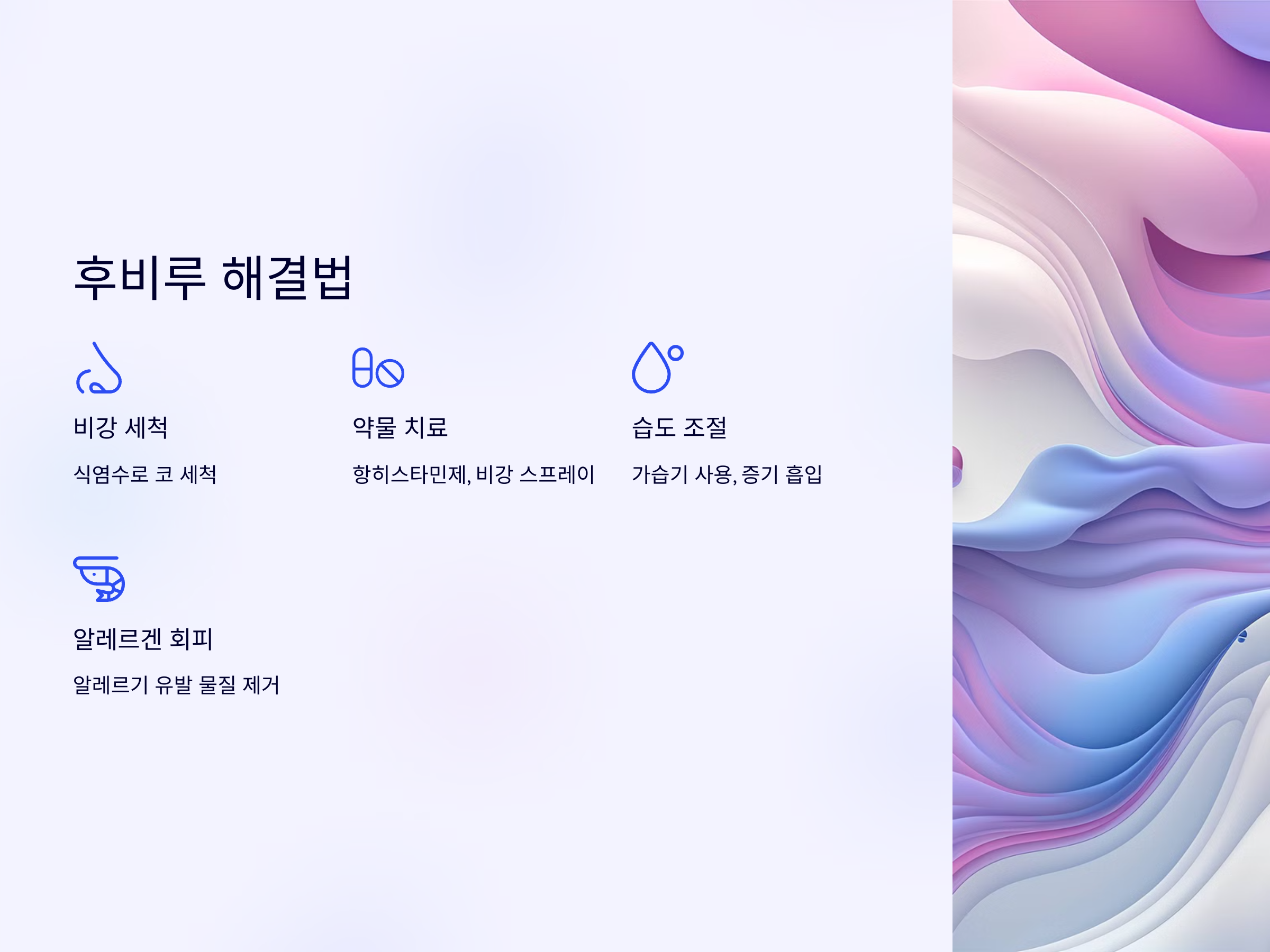 후비루로 인한 불편을 해결하기 위해서는 원인에 맞는 치료가 필요합니다. 다음은 후비루 증상을 완화하는 방법들입니다.