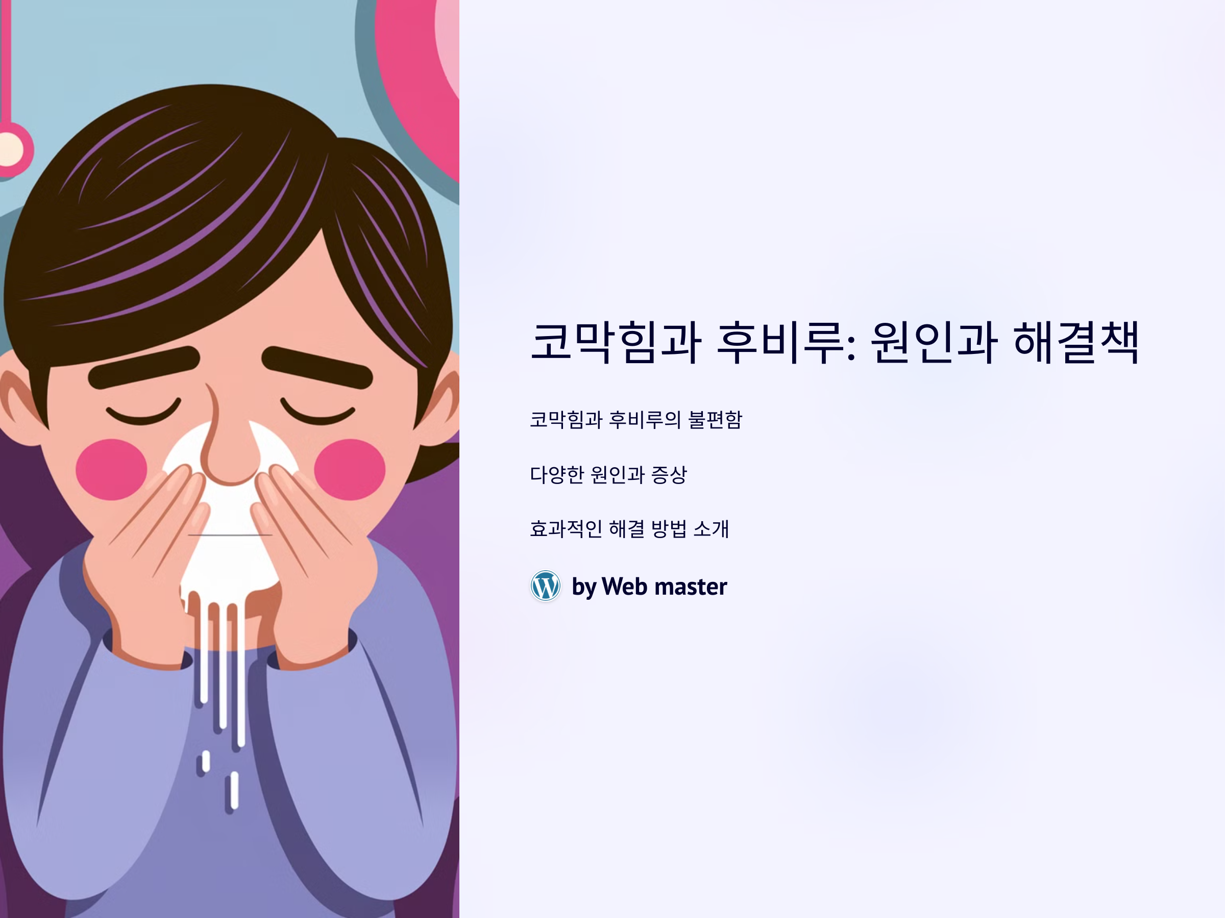 코막힘과 후비루는 많은 사람들이 겪는 불편한 증상입니다. 특히 콧물이 목 뒤로 넘어가는 후비루 증상은 불쾌감을 줄 수 있으며, 이를 해결하기 위해서는 그 원인과 치료 방법을 정확히 이해하는 것이 중요합니다. 이 글에서는 코막힘과 후비루의 원인, 증상, 그리고 해결 방법에 대해 알아보겠습니다.